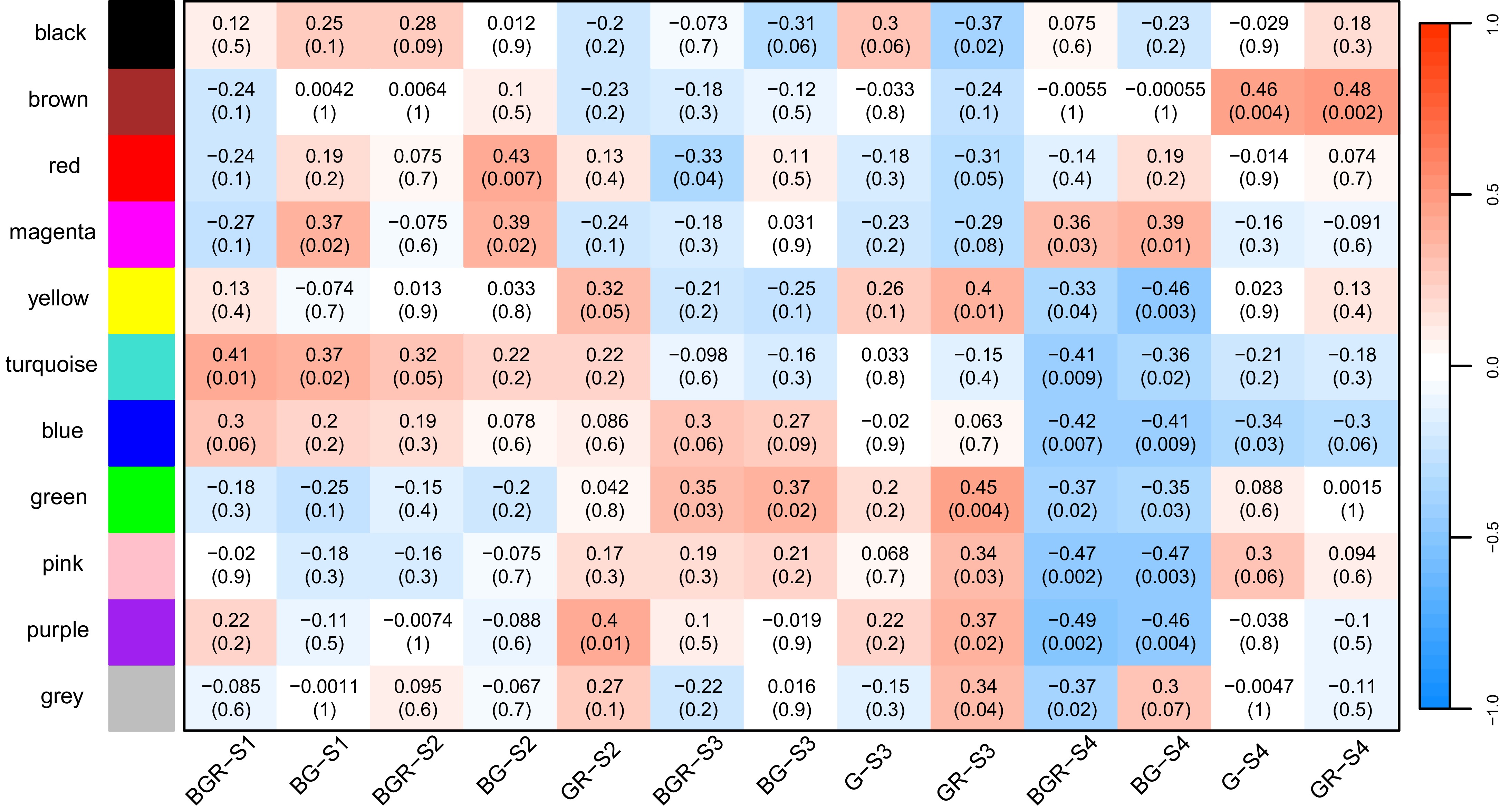 The correlations between gene modules and tissues from WGCNA results. Each gene module was assigned a particular color. Greater than zero was a positive correlation, and less than zero was a negative correlation. The values in the module represent the magnitude of the correlation, and the values in parentheses denote the p-value.