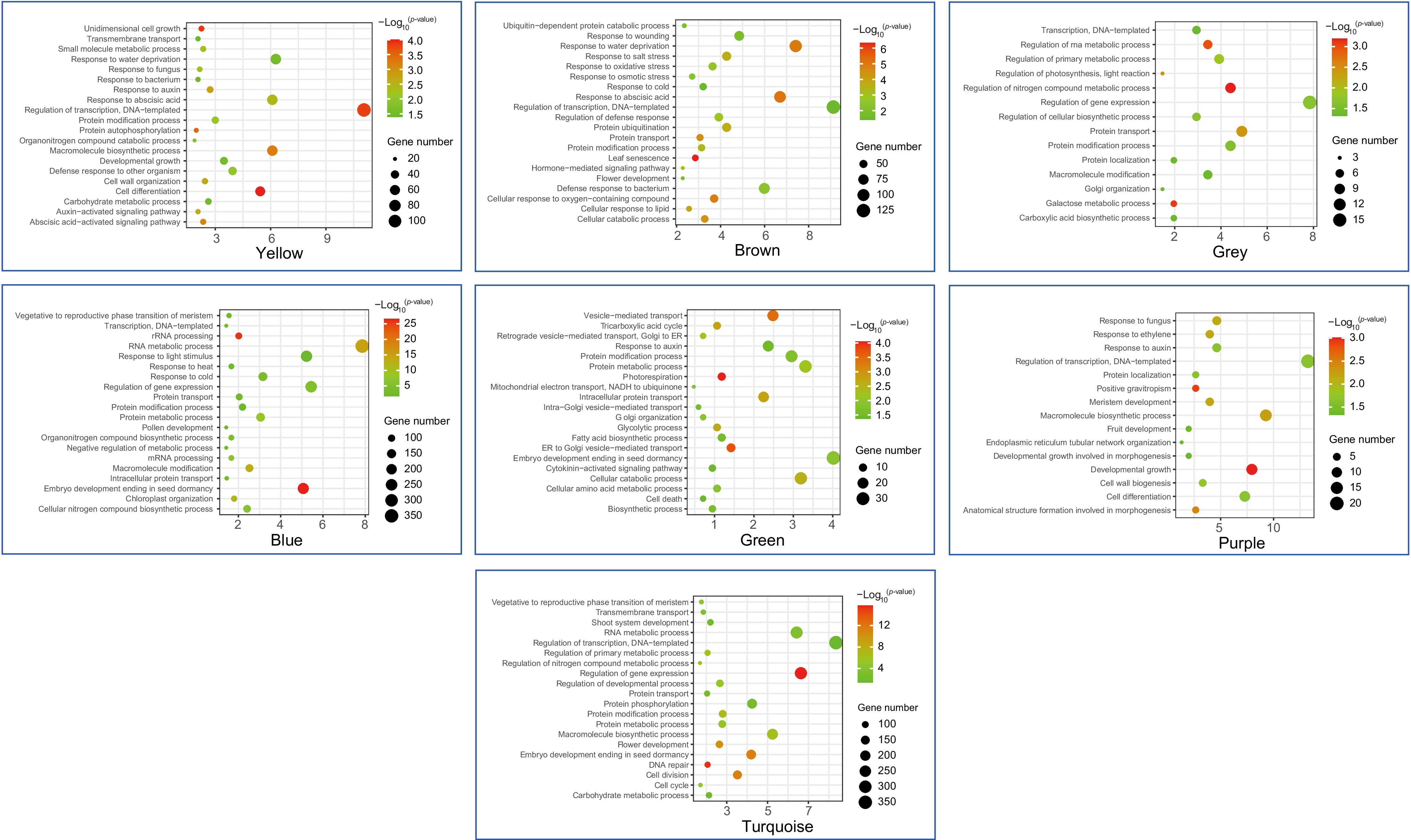 The GO enrichment analysis of seven modules containing VpMADSs. Yellow, brown, grey, blue, green, purple, and turquoise meant different modules in WGCNA analysis.