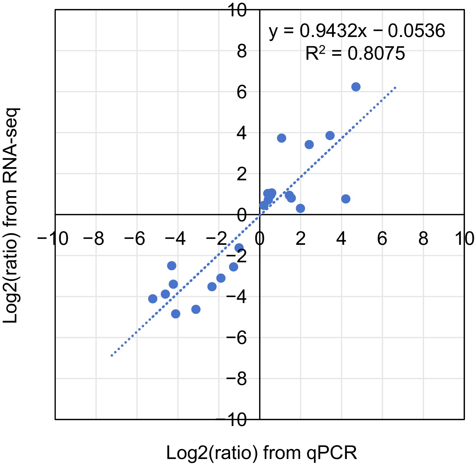 Coefficient analysis of fold change data between qPCR and RNA-seq.