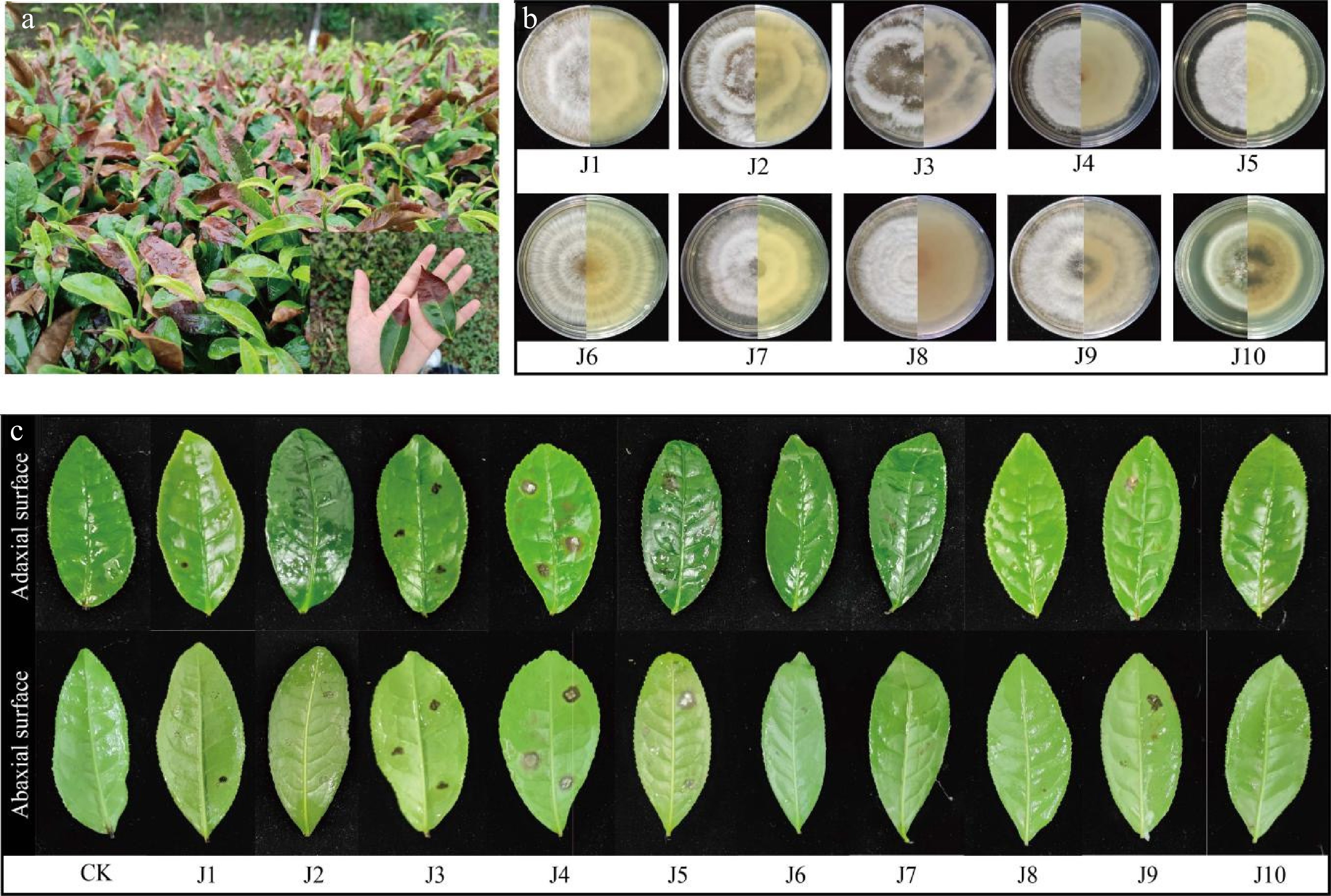 • During May to June 2023, large-scale red spotted tea leaves emerged in the tea plantation. Red leaf spots were predominantly concentrated on older leaves, spreading inward from the leaf tips. They featured concentric ring patterns, irregular shapes and edges, and a shriveled, reddish brown appearance. Diseased parts were dried, brittle, and hard, with a distinct pale yellow boundary at the diseased healthy interface (Fig. 1a). Pathogens were isolated from diseased leaves using the tissue separation method. Ten pathogenic strains, designated as J1−J10, were obtained (Fig. 1b). All ten strains exhibited obvious concentric rings, yet with varying ring spacings. J1, J2, J3, and J9 had wider ring spacings; J6, J7, and J10 had intermediate spacings; J8 had the densest rings; and J4 and J5 showed no distinct ring distribution. Colonies of J1−J9 were white, cotton-like on the front with uneven edges, while J10's colony was green, cotton-like on the front. The backsides of J3 and J8 colonies were light pink; the center backside of J10's colony was brown green; and the remaining seven strains had light yellow backside colonies. Pathogenicity tests on detached tea leaves revealed that J1−J5 and J9 successfully re-infected, while tea leaves inoculated with J6, J7, J8, and J10 were indistinguishable from the blank control (Fig. 1c).