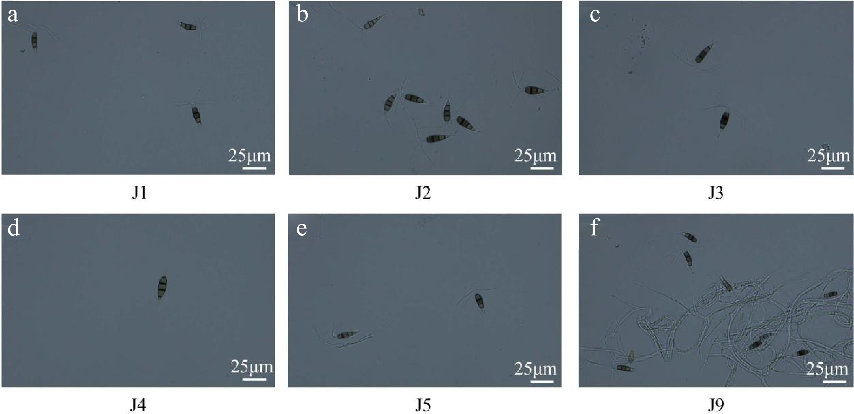 • At 40× magnification, the conidia were spindle to rod-shaped, with some slightly curved (e.g., J2 spores). They measured 25−30 μm in length and 6−9 μm in width. The conidia consisted of five cells: the middle septum was black, the terminal cells were transparent, and the middle three cells were brown, with the color fading from the head to the tail. Except for J4, strains J1−J3, J5, and J9 had 2–3 transparent appendages (5–8 μm in length) at the apex and one appendage (3–5 μm in length) at the base. J4 spores lacked appendages but had thickened cell walls at both ends (Fig. 2d). Based on colony and conidial morphology, the strains were preliminarily identified as belonging to the genus Pestalotiopsis.