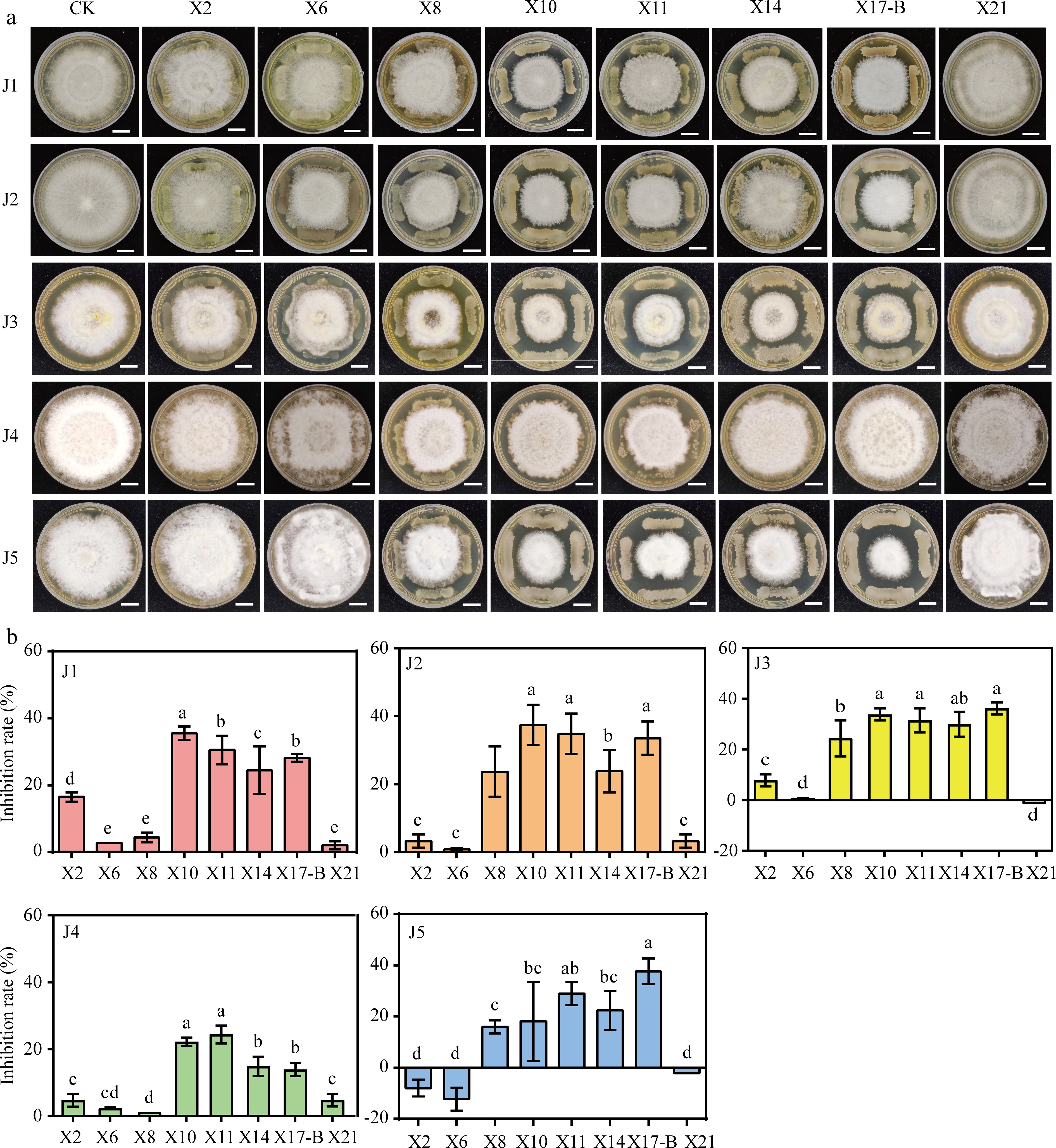 • Tea rhizosphere soils were collected from severely diseased tea plantations. Eight strains with significant antagonistic effects against pathogens, namely X2, X6, X8, X10, X11, X14, X17-B, and X21, were screened out. Plate confrontation assays showed that these eight strains inhibited the growth of J1−J5 to varying degrees. The growth rates of inhibited pathogens were significantly lower than those of the control group (Fig. 4a). Statistical analysis of plate confrontation experiments revealed that these eight strains inhibited J1, J2, and J4. X21 promoted the growth of J3 and J5; X2 and X6 promoted the growth of J5. X10, X11, X14, and X17-B exhibited remarkable inhibitory effects on J1−J5 (Fig. 4b). The inhibition rates of X10 against J1−J5 were 35.57%, 37.42%, 33.86%, 22.19%, and 18.12%, respectively; those of X11 were 30.43%, 34.84%, 31.50%, 24.38%, and 28.99%; those of X14 were 23.48%, 23.87%, 29.92%, 14.88%, and 22.46%; and those of X17-B were 28.19%, 33.55%, 36.22%, 13.92%, and 37.68% (Supplementary Table S3).