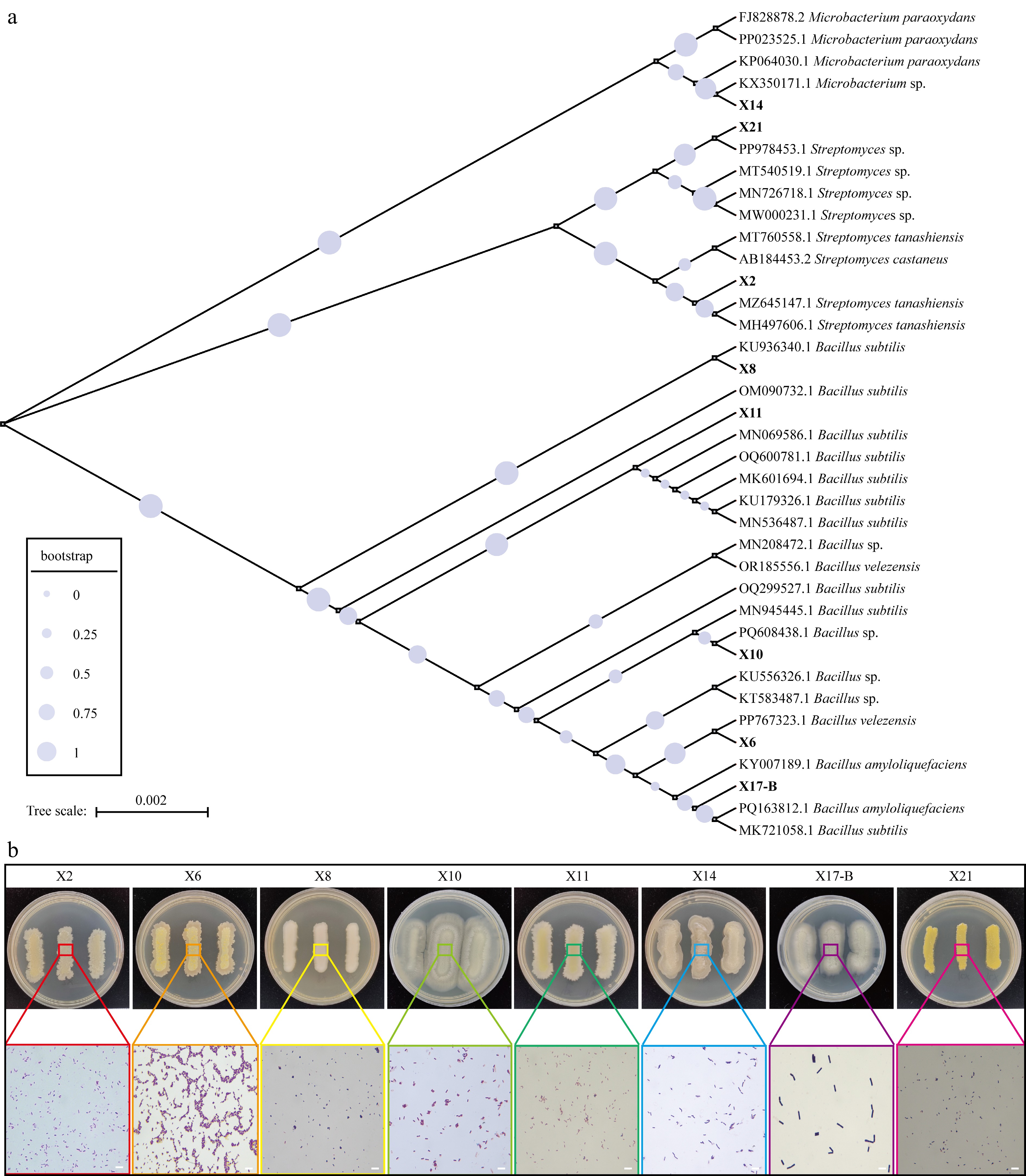 The phylogenetic and phenotypic analysis of biocontrol strains. (a) Phylogenetic tree of biocontrol strains and reference strains. The size of circles at nodes represents bootstrap values (0–1, with larger values indicating higher branch reliability, see the bootstrap legend). Tree scale = 0.002 represents genetic distance. (b) Colony morphology and Gram staining microscopic observation of biocontrol strains. The upper part shows the colony phenotypes of the strains on PDA medium (the numbers of the Petri dishes correspond to the strains: X2, X6, X8, X10, X11, X14, X17-B, X21), and the colored boxes mark the local areas of the colonies; the lower part shows the Gram staining microscopic images of the corresponding areas (magnification: 100 ×, scale = 1 μm), demonstrating the bacterial cell morphology and staining characteristics.