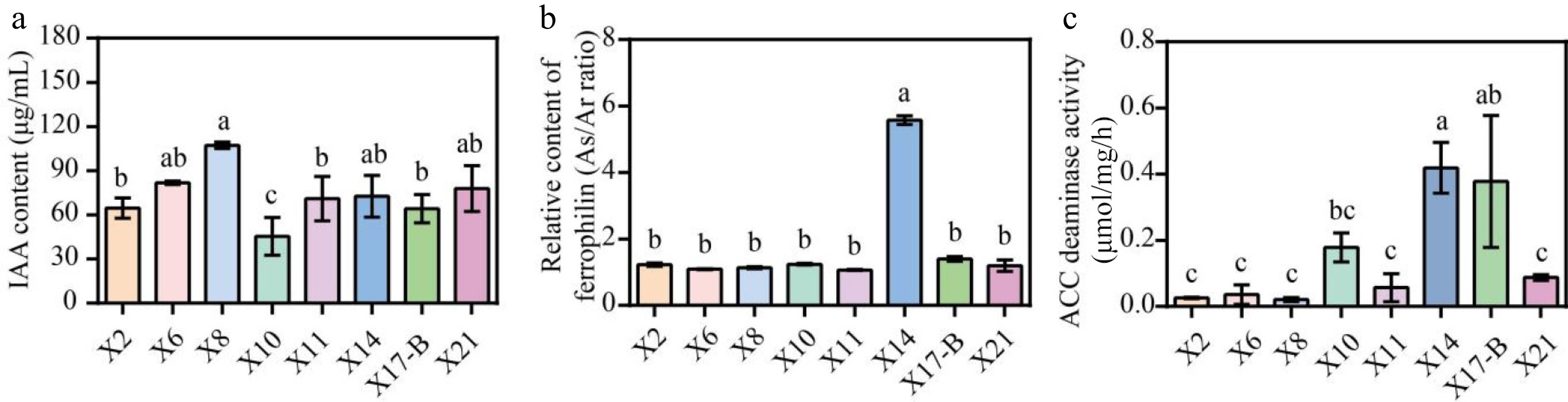 • All eight strains demonstrated the ability to produce IAA. Strain X8 had the highest IAA production, reaching 107.2 μg/mL. X6, X14, and X21 had secondary IAA yields of 81.9 μg/mL, 72.6 μg/mL, and 77.8 μg/mL, respectively. X2, X10, X11, and X17-B had relatively lower IAA yields of 64.6 μg/mL, 45.4 μg/mL, 71.0 μg/mL, and 64.1 μg/mL, respectively (Fig. 6a). In the siderophore secretion experiment, all eight strains had As/Ar values greater than 1, indicating no siderophore secretion ability (Fig. 6b). All strains possessed ACC deaminase activity. X14 exhibited the highest ACC deaminase activity, reaching 0.42 μmol/mg/h, followed by X17-B and X10 (Fig. 6c).