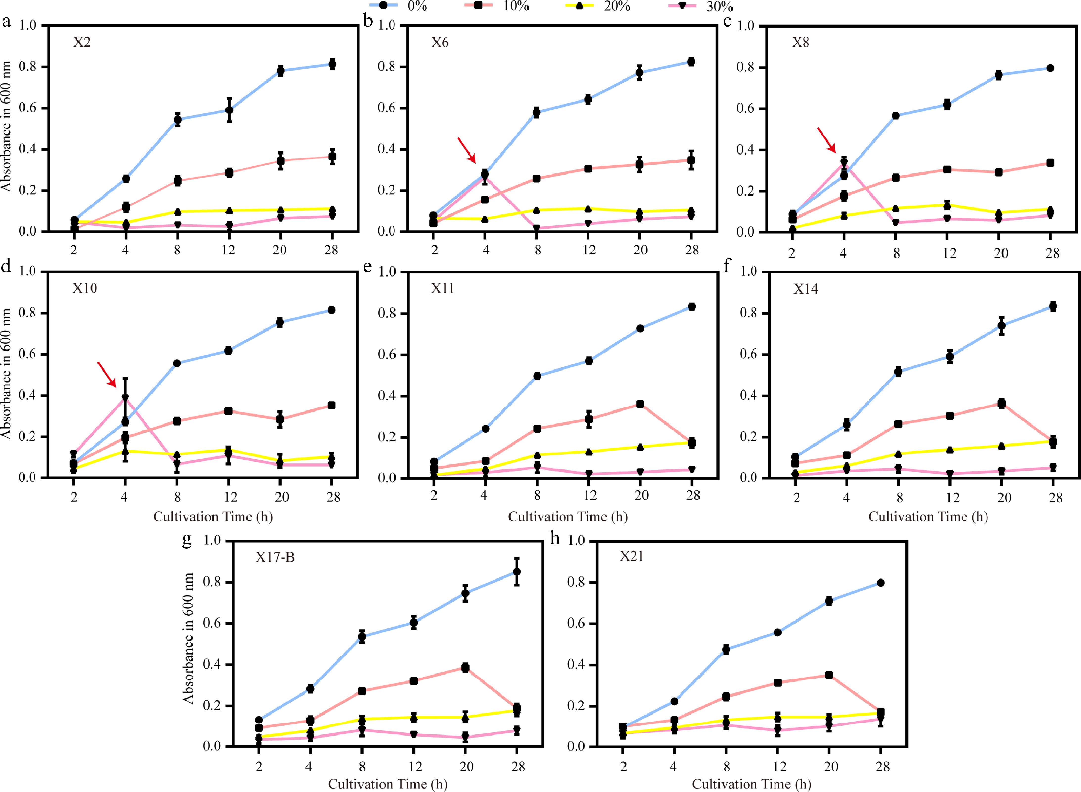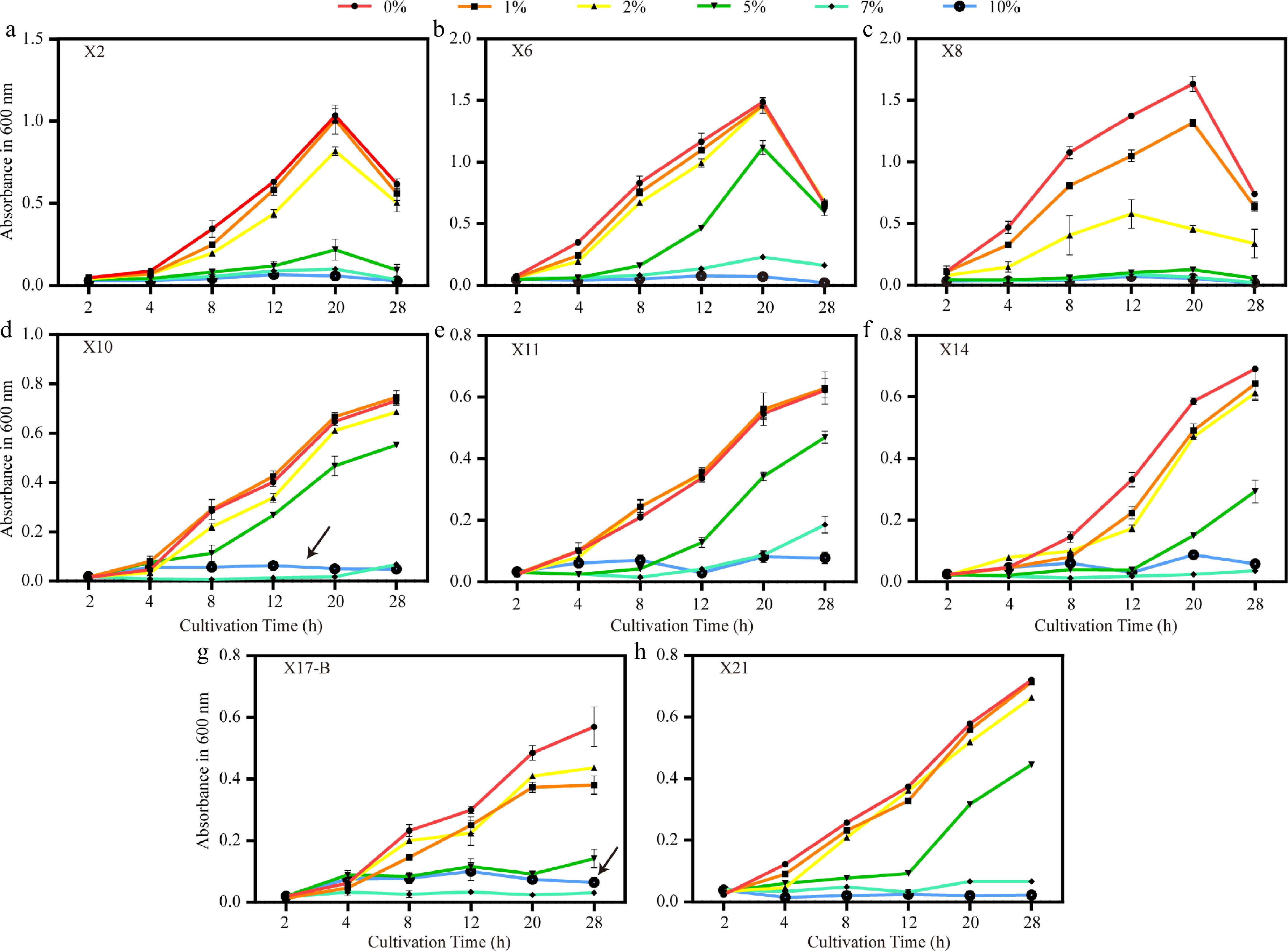 Growth trends of biocontrol strains under different NaCl concentrations. (a)–(h) Growth curves (OD600) of strains X2, X6, X8, X10, X11, X14, X17-B, and X21 under salt stress with 0%, 1%, 2%, 5%, 7%, and 10% NaCl. Black arrows indicate the atypical growth recovery of X10 and X17-B at 10% NaCl. Error bars represent standard deviations of triplicates (n = 3).