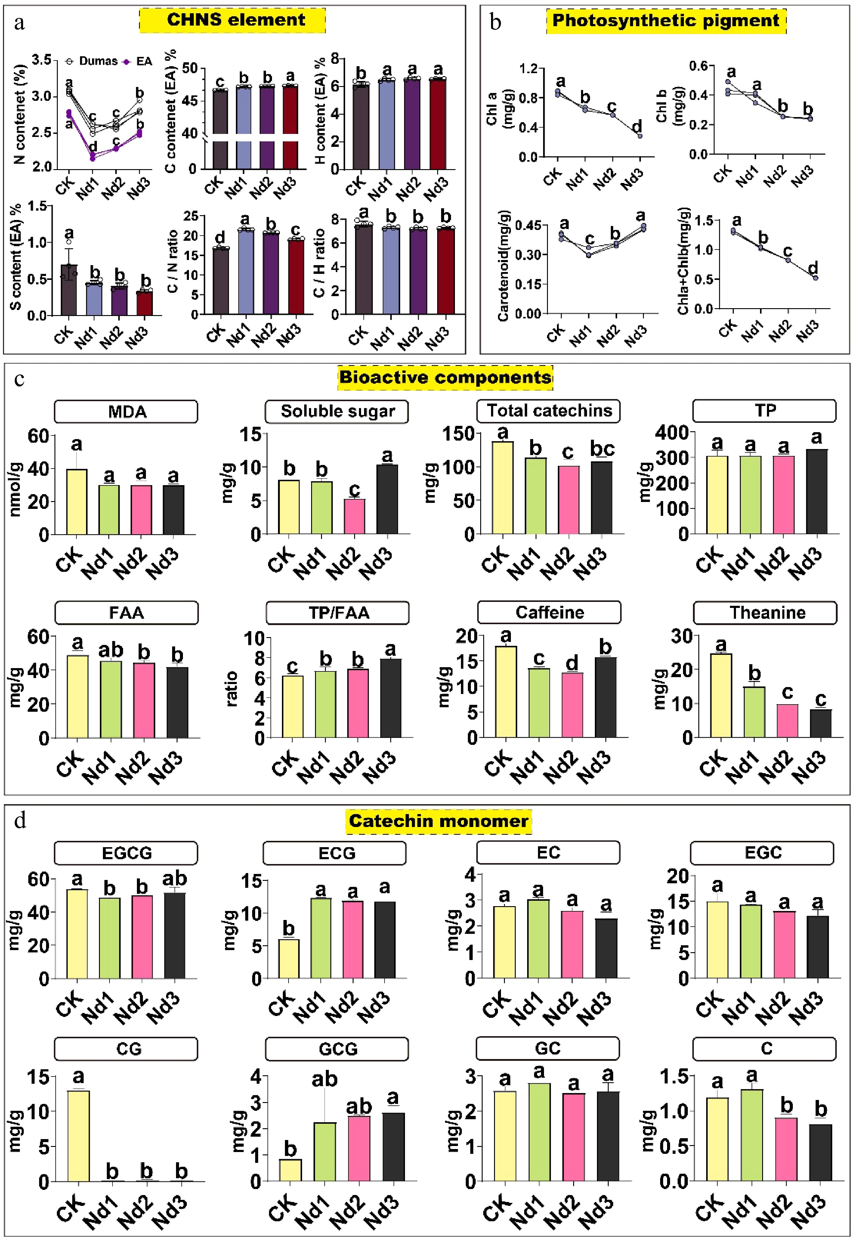 Physiological and biochemical changes in tea new shoots during nitrogen deficiency. Plants were subjected to deficiency treatments for 0 (CK, control), 7 (Nd1), 15 (Nd2), and 30 (Nd3) days. (a) Analysis of carbon, hydrogen, nitrogen, and sulfur elements. (b) Analysis of photosynthetic pigments. (c) Analysis of bioactive components. (d) Analysis of catechin monomers. The data represent the mean ± SD (n = 4) for soluble sugar content (n = 3). Different letters indicate significant differences at p < 0.05 determined by Duncan′s multiple range test. Malondialdehyde, MDA; total free amino ccid content, FAA; total polyphenol content, TP; catechin, C; epicatechin, EC; gallocatechin, GC; epigallocatechin, EGC; epicatechin gallate, ECG; gallocatechin gallate, GCG; catechin gallate, CG; epigallocatechin gallate, EGCG.