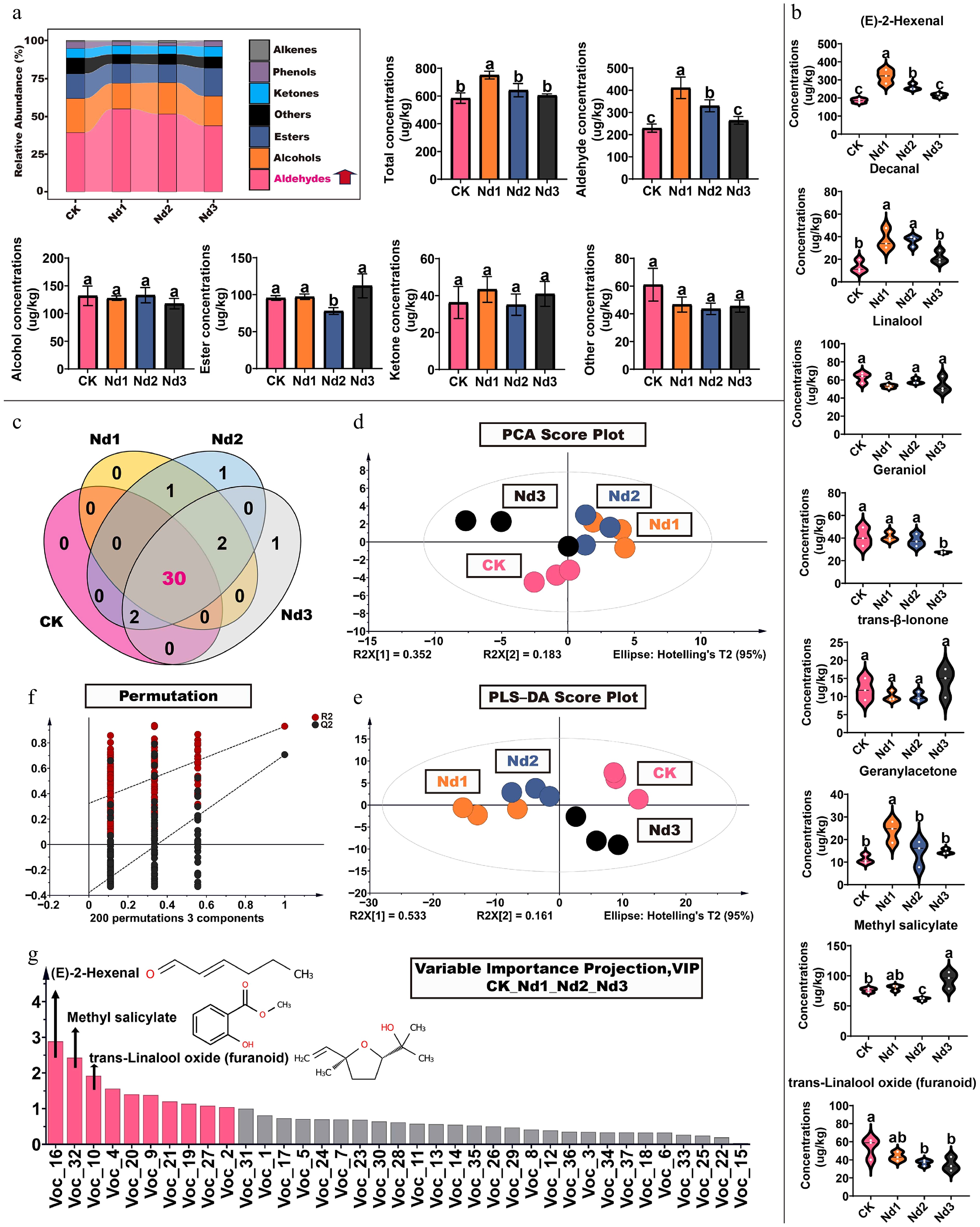 Changes in volatile component levels in new shoots of tea under nitrogen deficiency treatment. (a) Proportion of volatile components: total concentration, aldehydes, alcohols, esters, ketones, and other volatile compounds concentrations. (b) High concentration volatiles. (c) Venn diagram of volatile component counts. (d) Principal component analysis; (e) 200 permutation tests. (f) Partial least squares analysis. (g) Projection of important variables. The data represent the mean ± SD (n = 3). Different letters indicate significant differences at p < 0.05 determined by Duncan's multiple range test.