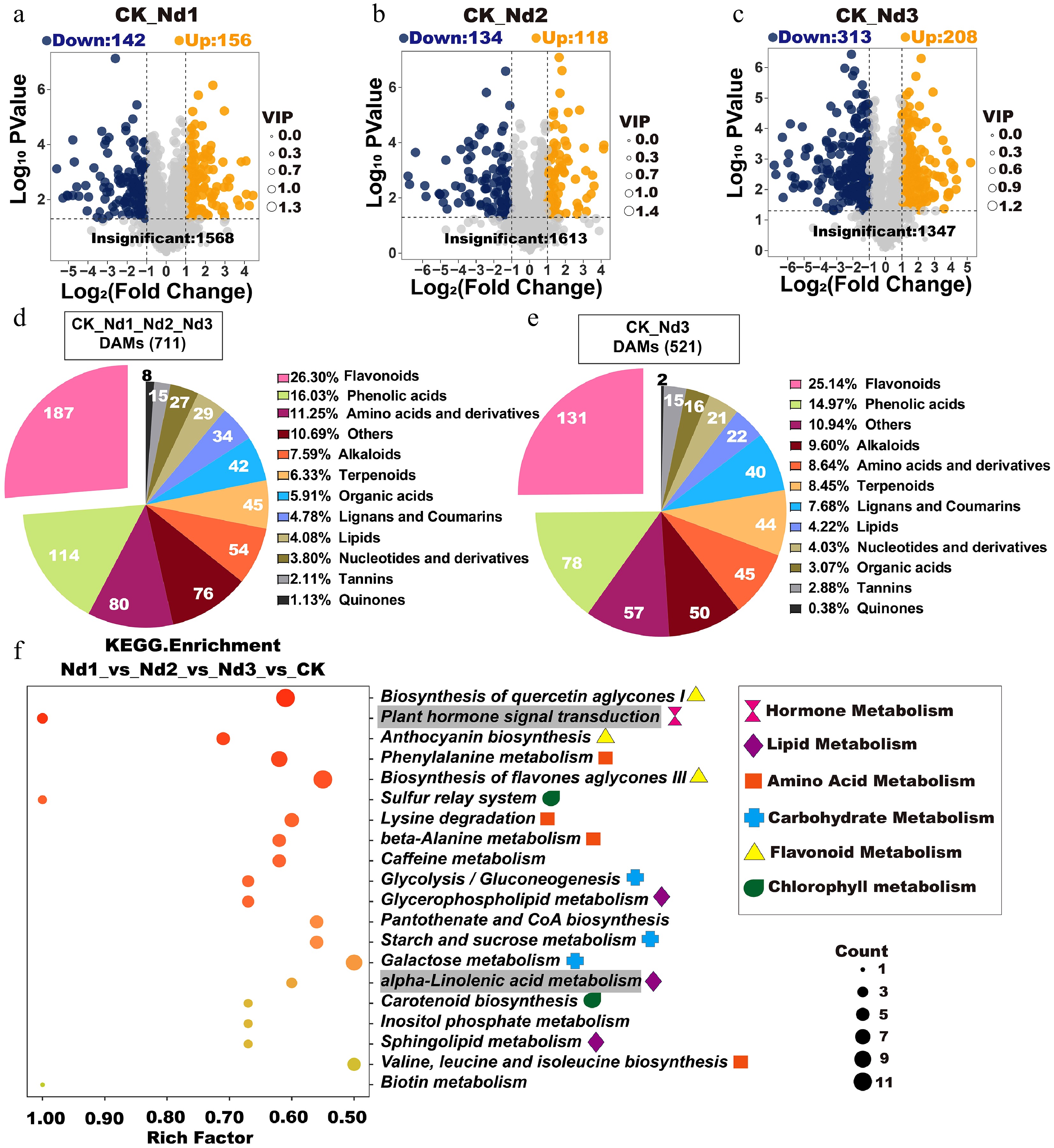 Analysis of differential accumulation metabolites (DAMs) in new shoots under the nitrogen deficiency treatment. (a–c) Volcano plots of DAMs. Each point represents a metabolite: Blue = downregulated), orange = upregulated, and gray = nonsignificant. The x-axis indicates the log2FC in relative abundance, the y-axis shows log10 p-values, and the point size corresponds to VIP values. Higher y-axis values denote stronger statistical confidence. (d) The categorical distribution of shared DAMs across four treatment groups. Pie chart sectors represent distinct metabolite classes, with numeric labels indicating the absolute counts per category and percentages, reflecting their proportion relative to total DAMs. (e) Types, quantities, and proportions of DAMs shared between the CK and Nd3 groups. (f) KEGG enrichment analysis of the CK, Nd1, Nd2, and Nd3 comparison groups. Gray-shaded pathways indicate significant enrichment in all pairwise comparisons (validated in Supplementary Fig. S3).
