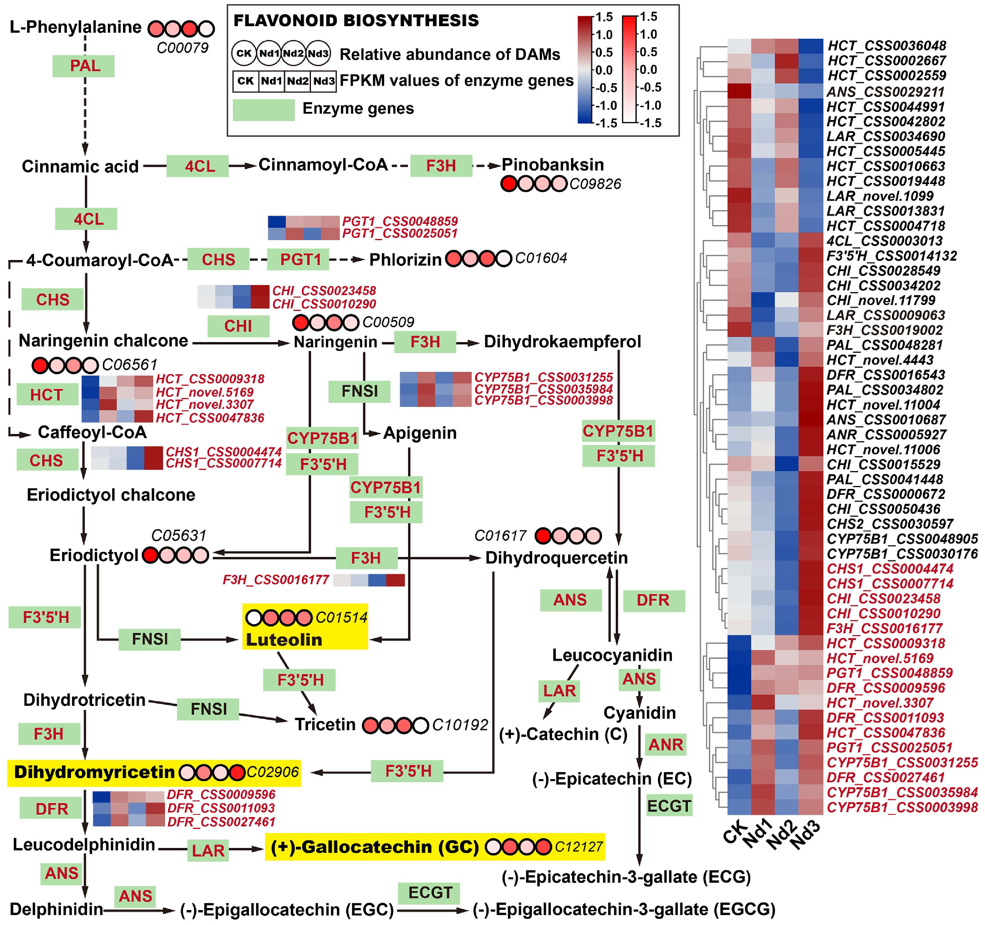 Integrated analysis of flavonoid biosynthesis pathways' responses to nitrogen deficiency in new shoots. Green rectangular nodes represent enzyme genes annotated in KEGG pathways, with red labels indicating significantly DEGs (|log2FC| ≥ 1, FDR < 0.05). Red circular nodes indicate metabolites' relative abundance (KEGG IDs are specified, e.g., C00079), with darker red reflecting higher abundance. In the heatmap, genes in red show upregulated trends across nitrogen deprivation stages (CK→Nd3). Metabolites in yellow exhibit significant accumulation versus the controls (log2FC > 1.0). All data were normalized via Z-score transformation in TBtools.