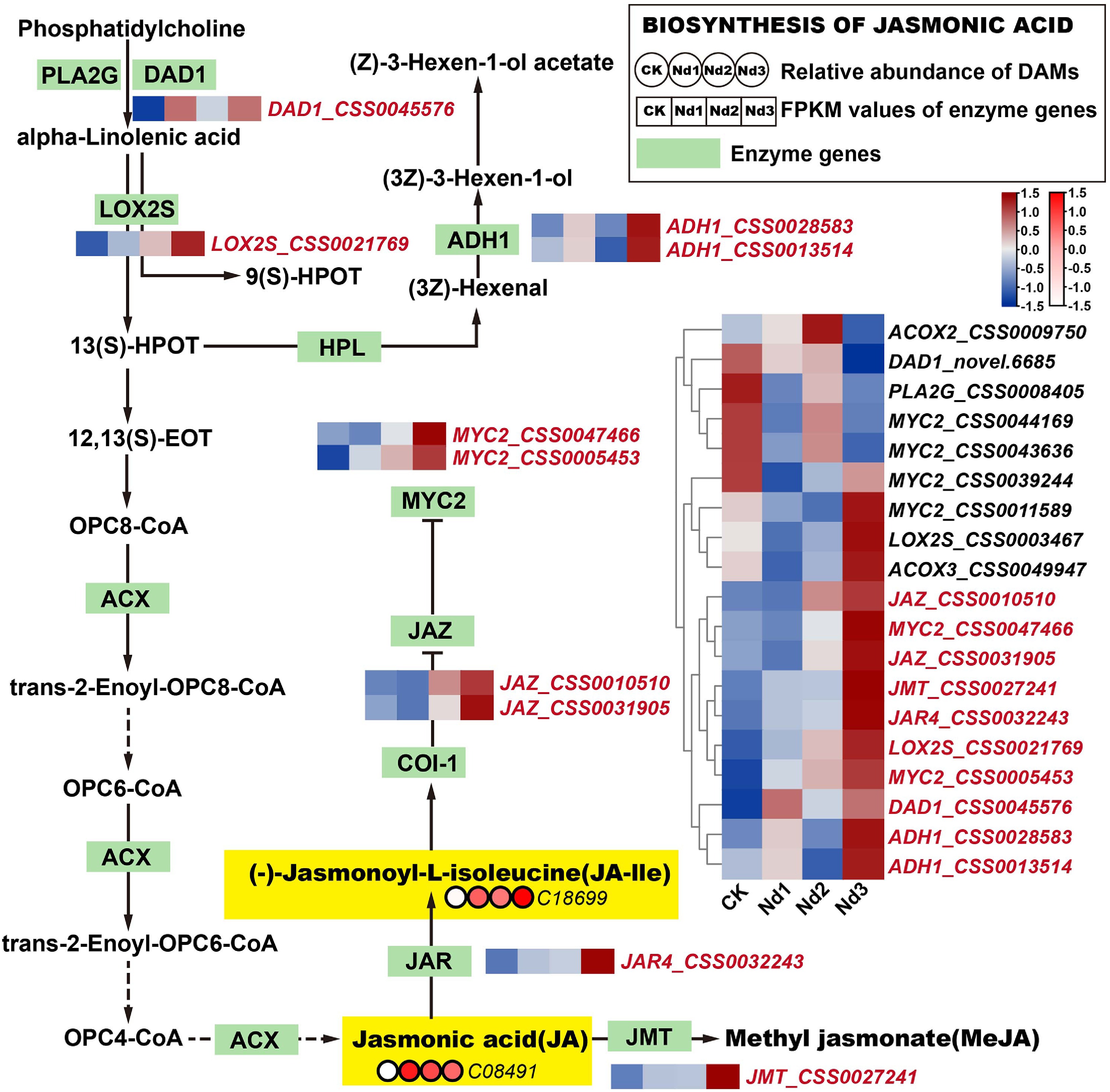 Integrated analysis of the JA biosynthesis pathway's responses to nitrogen deficiency. Green rectangular nodes represent KEGG-annotated genes, with red labels marking significantly DEGs (|log2FC| 1, FDR < 0.05). Red circular nodes indicate metabolites' relative abundance (e.g., C08491 = JA), with darker red denoting higher abundance. In the heatmap, genes in red show upregulated expression trends across nitrogen deprivation stages (CK→Nd3). Metabolites in yellow exhibit significant accumulation versus the controls (log2FC > 1.0). (-)-Jasmonoyl-L-isoleucine, JA-Ile; jasmonic acid, JA; methyl jasmonate, MeJA; total polyphenol content, TP. All data were normalized via Z-score transformation in TBtools.