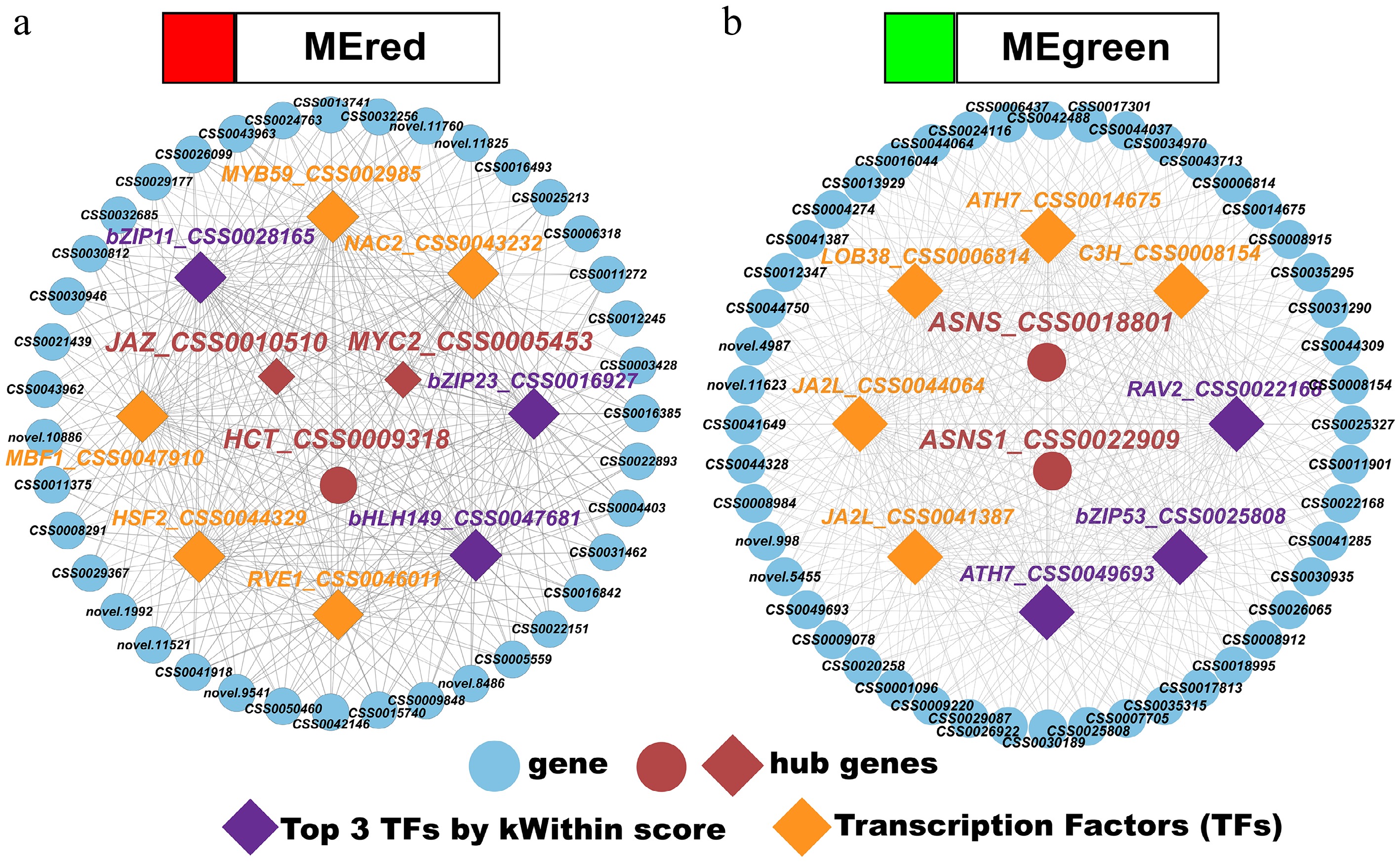 (a), (b) Transcription factor–gene regulatory networks for the red and green modules.