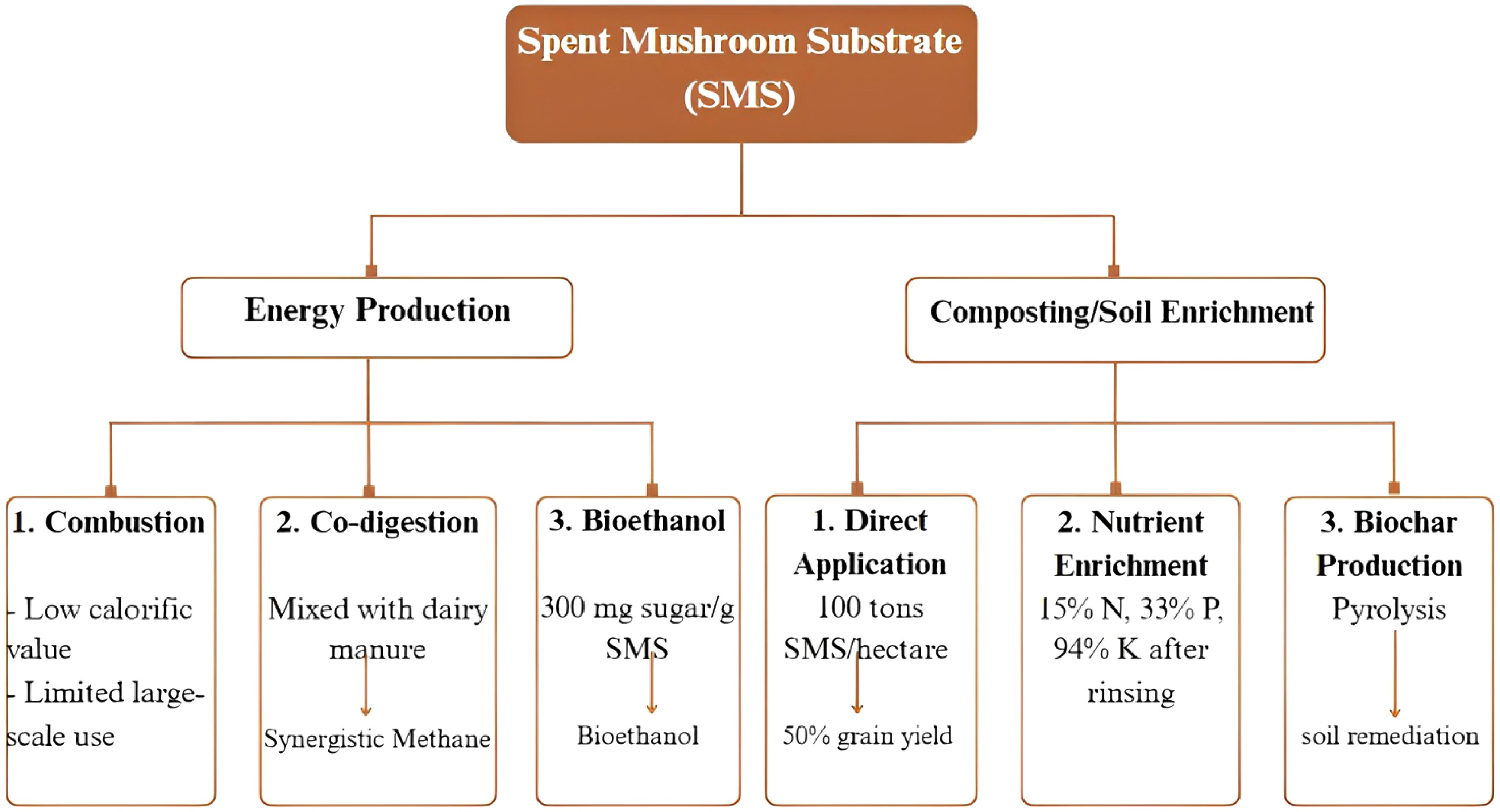 • Economic growth is greatly aided by the production of mushrooms, especially when spent mushroom substrate (SMS) is used. Mushroom cultivation has extended its sale globally with an annual growth rate of 2000. The market value was estimated to be worth over USD ${\$} $50 billion in 2022[21]. Economically, it has profited further by using SMS as a revenue stream through its sale for biofertilizer, compost, and energy generation. From the market perspective, using SMS for the production of bioethanol can yield between 200 and 300 per ton of substrate[22]. In a similar vein, the production of biofertilizer and SMS-based compost can range from 50 to 100 per ton, contingent on processing techniques and nutrient content[23]. This approach helps us find the best ways to use SMS effectively. Omics technology can identify important avenues for improving the production of biofertilizer and SMS-based compost. Its commercial and environmental value can be further enhanced by using CRISPR/Cas9 to develop microorganisms that improve SMS breakdown or nutrient extraction[24]. SMS can be utilized for energy production; although its economic and environmental feasibility depends on the method employed[25]. One way to use SMS for energy is by burning it (combustion), which generates temperatures suitable for producing salable heat. However, the calorific value of SMS is generally not high enough for large-scale energy production, limiting its widespread use in this sector[26]. Alternatively, another creative approach is co-digestion, where SMS is mixed with other organic materials, such as dairy manure, to produce methane gas. For instance, a mixture of SMS from Flammulina velutipes or Pleurotus eryngii with dairy manure has shown a synergistic effect, releasing more methane than either material alone[27]. SMS from Pleurotus ostreatus, composed of forage, wheat straw, corncob, and cottonseed, has been investigated as a sugar source for bioethanol production[28].