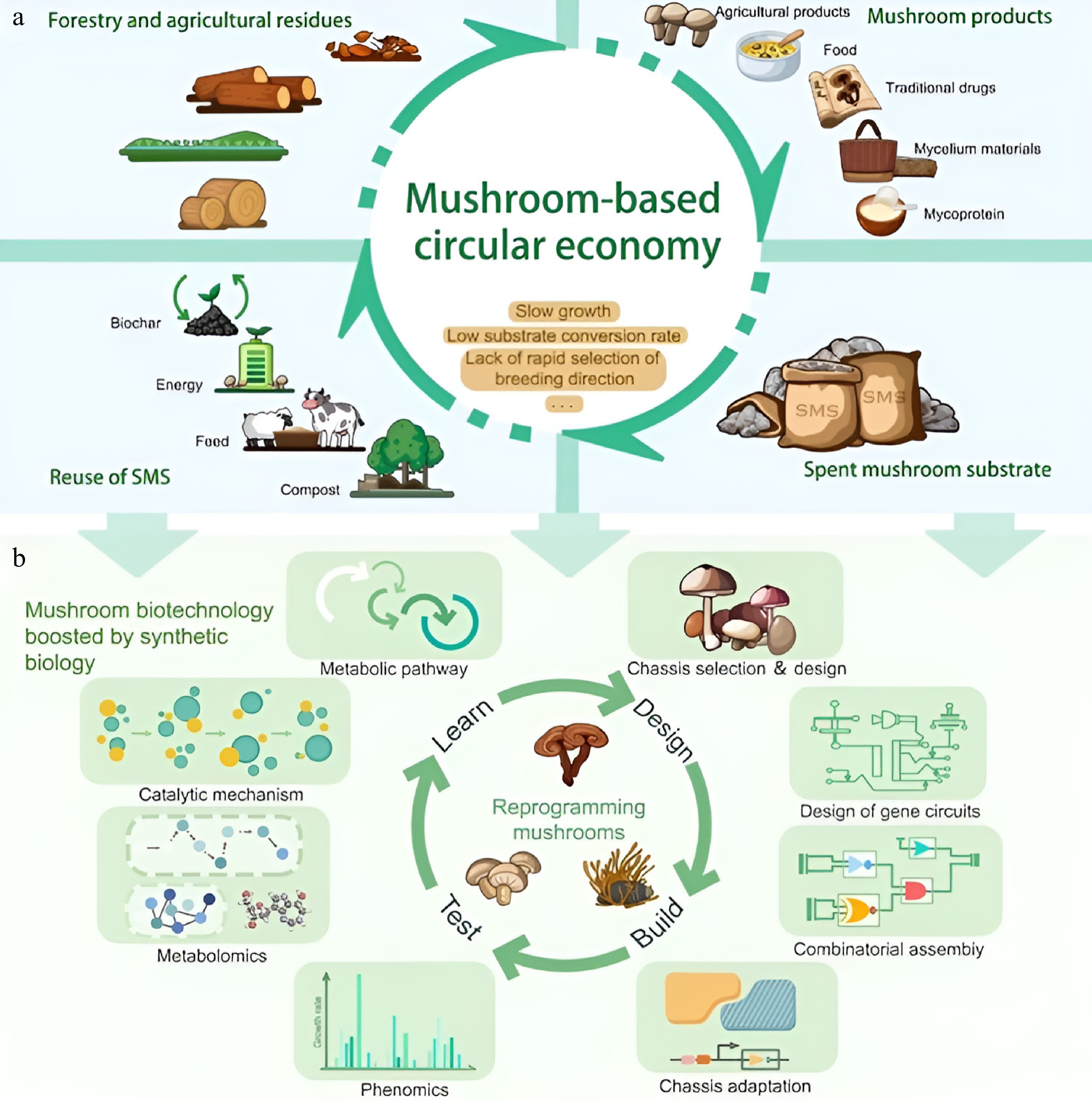 The evolution of design science has altered mushroom growth from a focus on regular improvements to extensive applications based on advanced biotechnology. (a) Inefficiencies in traditional agriculture include restricted SMS reuse, sluggish growth, and poor substrate usage. Value creation possibilities are lost, and waste is produced by the linear approach. (b) To rewire mushrooms for better qualities, the synthetic biology toolkit employs metabolic engineering, gene circuits, and chassis design. Precision breeding allows for faster development of strains with optimized growth, substrate digestion, and metabolite profiles. Engineered strains convert SMS into advanced materials and energy[14].