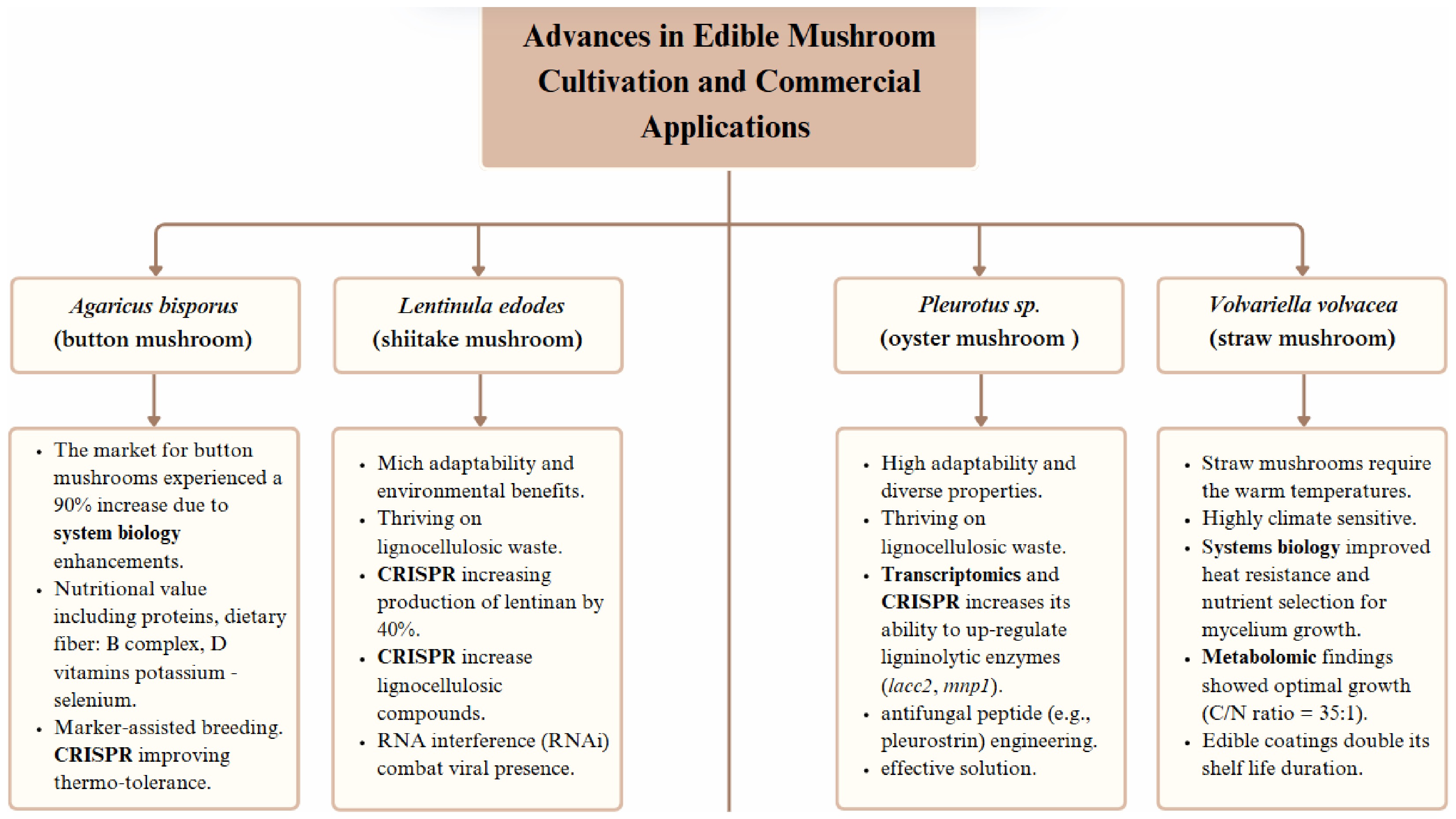 Lentinula edodes is the third most cultivated mushroom in the world because of its medicinal worth. The demand for Lentinula edodes exceeds 8 million tons per year because of its high economic value. Systems biology research performed on shiitake mushrooms revealed essential gene changes and metabolic system modifications that have boosted the development of mushrooms, along with their bioactive compounds. During the fruiting phase, transcriptomics research showed that LELent1 (lentinan synthase) and LEGlu1 (β-1,3-glucanase) genes are expressed more frequently[60]. The implementation of CRISPR technology on specific genes increased lentinan production by 40%[61]. Every year, shiitake extract sales generate ${\$} $500 million for the nutraceutical market because the extracts enhance the immune response, thus demonstrating great commercial potential[62]. Tropical and subtropical areas make widespread use of Pleurotus ostreatus and Pleurotus pulmonarius because these oyster mushrooms thrive on lignocellulosic waste, including rice straw and coffee pulp[63]. The traits of P. ostreatus have improved through transcriptomics analysis and CRISPR technology to increase its ability to upregulate ligninolytic enzymes (lacc2, mnp1) to degrade waste materials and enhance immune reactions[64]. Another edible mushroom species, Volvariella volvacea (straw mushroom), is successfully cultivated throughout Southeast Asia. The transcriptomics evaluation of VvHSP60, a heat stress control gene, has been found to increase production by 15% when heat-treated to 35 °C[65]. The production of straw mushrooms encounters difficulties because of its high vulnerability to contaminants and the brief expiration period after harvest, which is as short as three days or less. Researchers have introduced edible coatings made from waste-derived chitosan from Agaricus bisporus to double its shelf life [66]. Innovations in mushroom cultivation are enhancing productivity, resilience, waste recycling, and bioactive compound production, aligning with eco-friendly biotechnological modernism and the production of functional food. A simplified representation (Fig. 3) of various mushroom species highlights their commercial and scientific potential, leading to important sustainable niches and commercial possibilities.