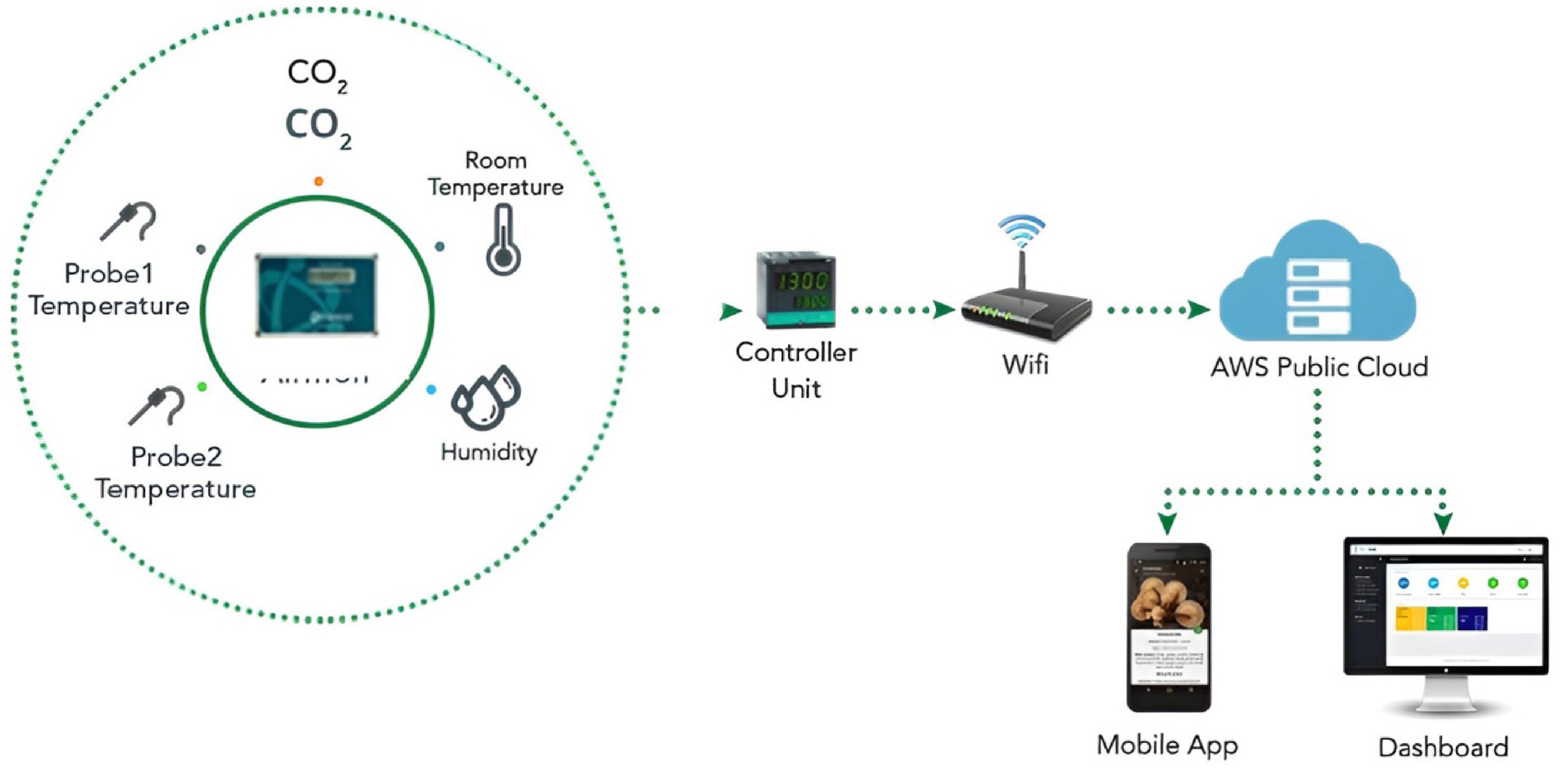In order to reduce expenses through automation and enable users to track mushroom growth and conditions in real time from any location, a system of plug-detectors and IoT technologies is being integrated into mushroom farming procedures[117]. It offers a new platform that enables data transmission between computing devices, unique identity (UID) holders, digital or mechanical machines, animals, and humans without the need for human-to computer or human-to-human contact. A wireless network of sensor nodes (WSN) that can gather, transmit, and analyze data surrounding its perimeter is the main component of this IoT system[118]. It allows for problem-solving as well as the inception and management of machine-to-machine interactions. Additionally, in order to accomplish the goal of minimizing human involvement in the context of the IoT, the devices that are being targeted are fitted with transmitting devices and microcontrollers, which provide communication and setup using protocol stacks that identify interactions among the things being targeted[119]. The prototypes of new IoT projects can also be made possible by a variety of development boards, including microcontroller boards, system on chip (SoC) boards, and single-board computers (SBCs)[120]. Getting the greatest efficiency out of a mushroom farm requires step by step changes to ideal humidity, temperature, and CO2 depending on the development stage, which requires a robotized arrangement (or costly physical work)[121]. The variables of development are controlled in response to information from the sensors to follow an ideal development trend for the mushrooms at their particular growth phases. These phases, with the help of the AWS Public Cloud, which is a cloud computing model, provides farming infrastructure to operators via desktops and mobile phones, as shown in Fig. 5.