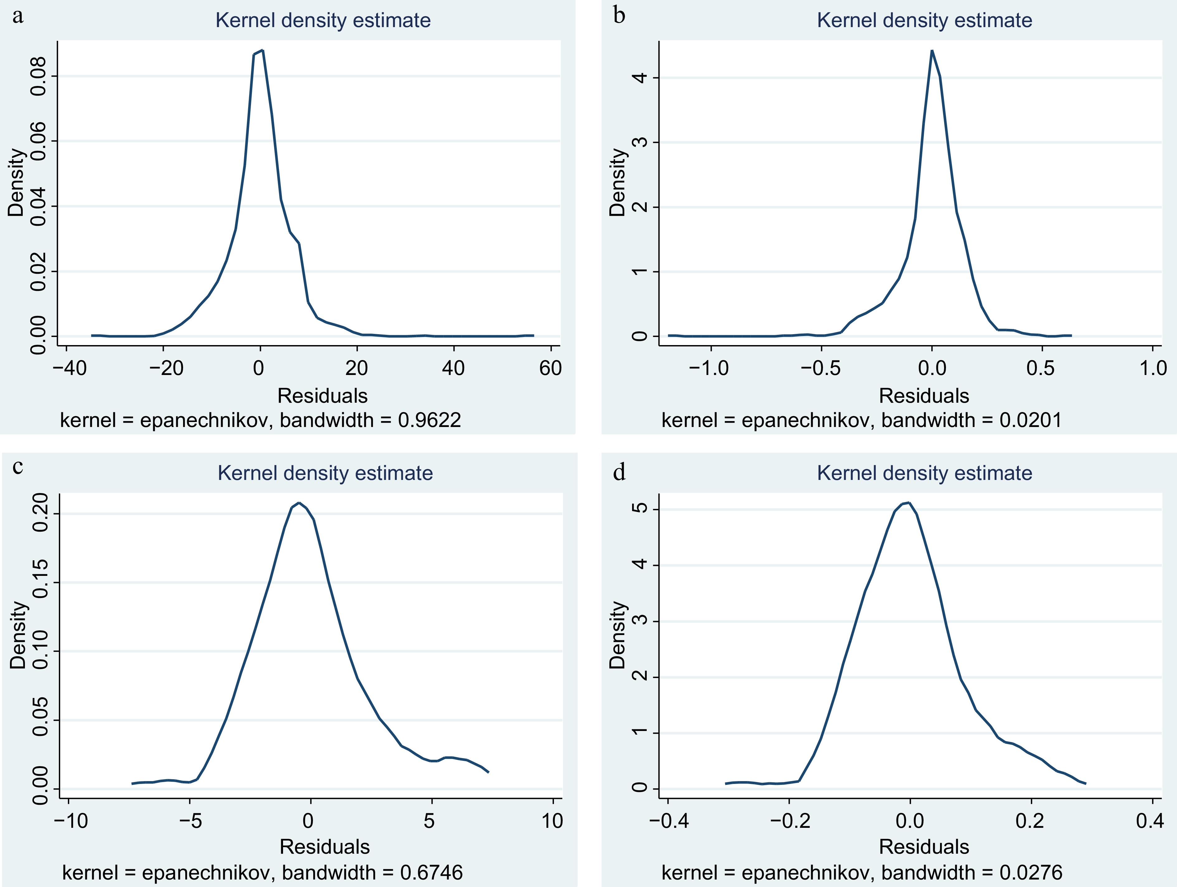 Residual diagnostics were conducted using kernel density estimation (Fig. 1) to ensure the robustness and reliability of the econometric models. This nonparametric technique evaluates the probability density function of the residuals, enabling the assessment of normality assumptions. The kernel density plots demonstrated that the residuals for both the paddy and wheat datasets were roughly normally distributed, confirming the primary assumptions required for the models.