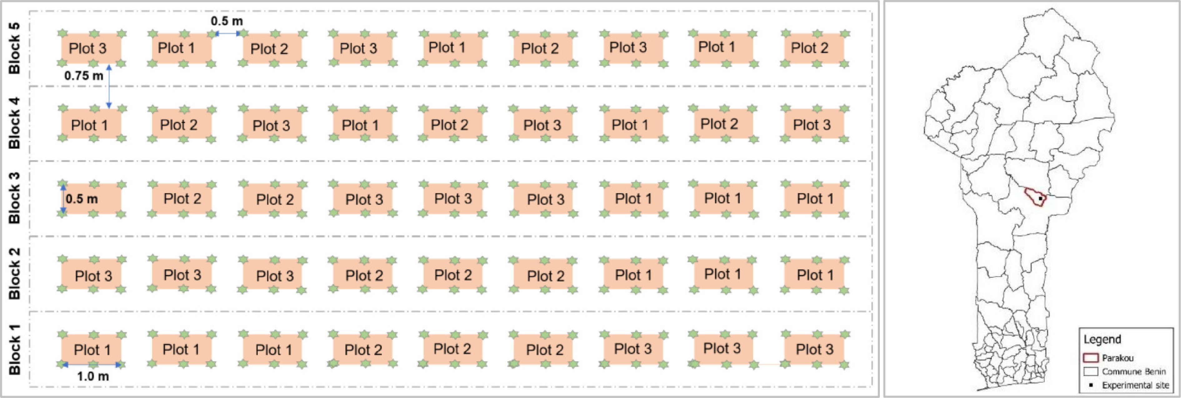 (left) Study design, and (right) location of the study site in the commune of Parakou (dark thick line), Benin Republic. Green stars are Adansonia digitata trees. Three plots were considered as a subblock that was replicated three times.