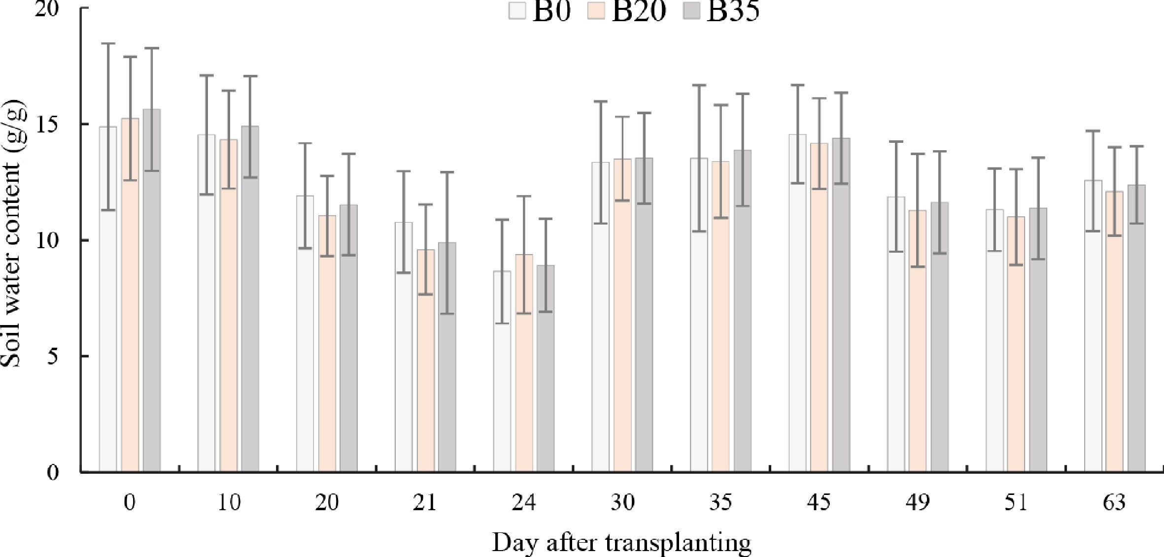 Variation of day after transplanting soil water content under biochar application. B0, B20, and B35 are 0, 20, and 35 g biochar application, respectively.