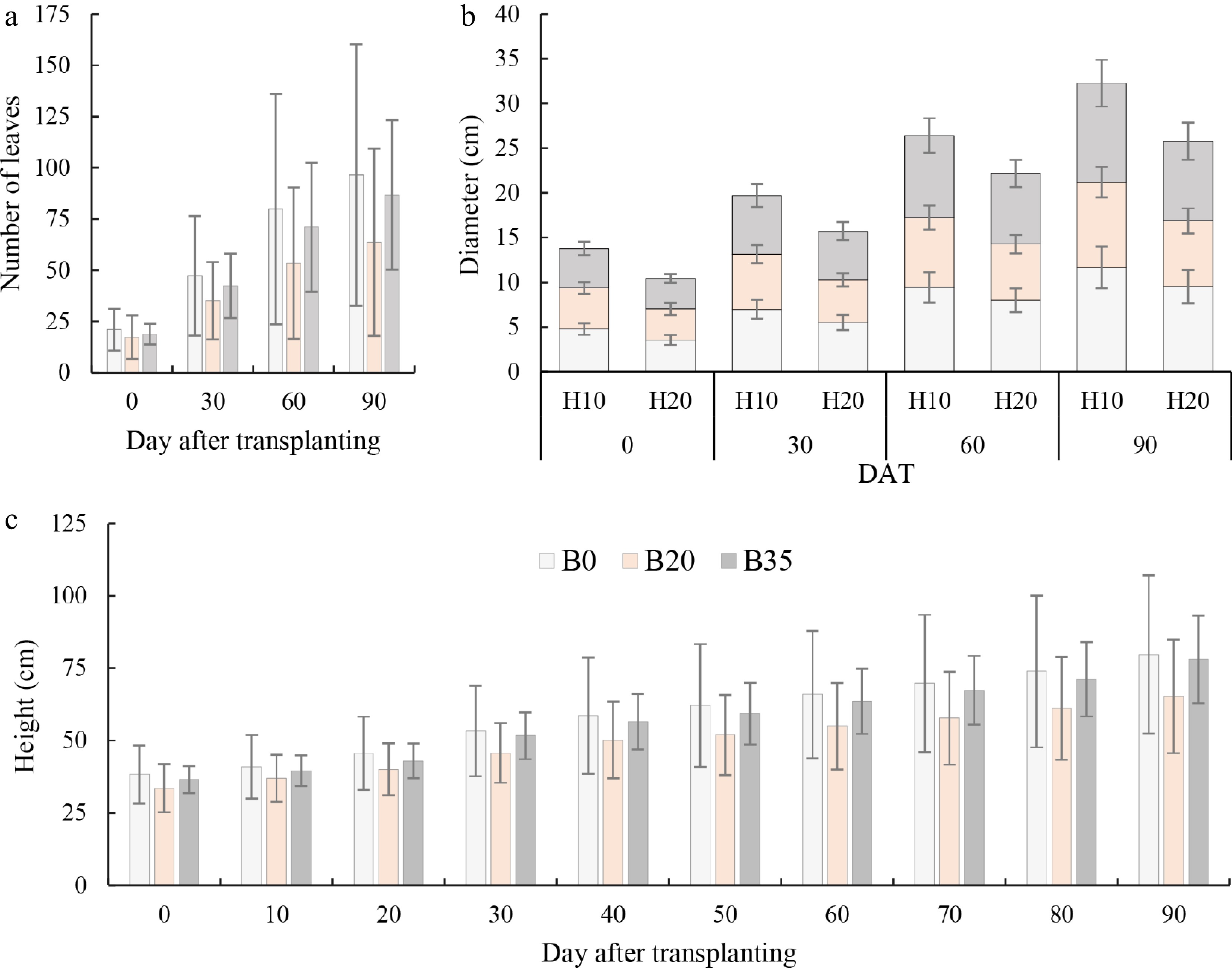 Variation of (a) day after transplanting number of A. digitata seedlings leaves, (b) stem diameter at two heights, and (c) seedling height under biochar application. B0, B20, and B35 are 0, 20, and 35 g biomass application, respectively. H10 and H20 are 10 and 20 cm height for diameter measurement.