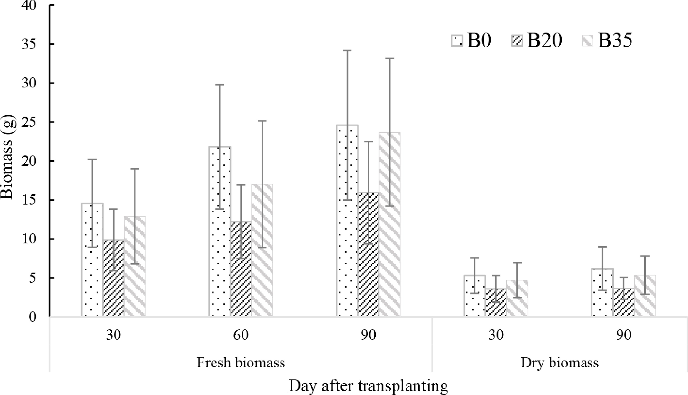 Fresh biomass yield differed significantly between DAT (p < 0.001), with a linear increase (30 < 60 < 90 DAT), while there was no difference in dry biomass between DAT (Fig. 4). Average fresh biomass was 38% and 12% lower under B20 and B35, respectively, compared to B0; while dry biomass was 35% and 13% lower. At each DAT, fresh biomass consistently followed the B0 > B35 > B20, except for 90 DAT, where B0 = B35 > B20. Similarly, dry biomass was consistently highest under B0, and lowest under B20 at 30 and 90 DAT (B0 > B35 > B20) (Fig. 4).