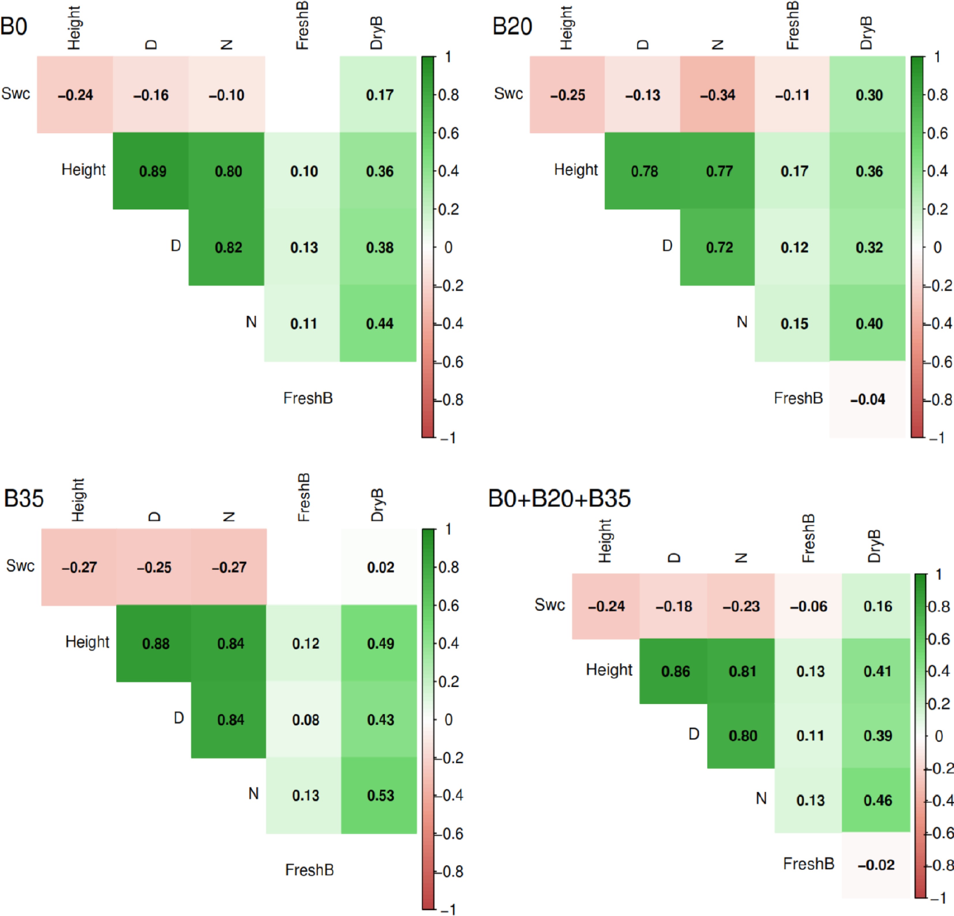 Generally, the soil water content was positively correlated with dry biomass (r = 0.16), but negatively correlated with plant height, diameter, leaf number, and fresh biomass (r = −0.24 to −0.06) in the overall dataset (B0 + B20 + B35) (Fig. 5). The plant height, diameter, and leaf number were all positively correlated with fresh and dry biomass (r = 0.11 to 0.86); however, fresh biomass was negatively correlated with dry biomass (r = −0.02). Overall, the correlation between soil water, plant growth, and biomass yields under B0, B20, and B35, followed the same trend as observed for B0 + B20 + B35 (Fig. 5).