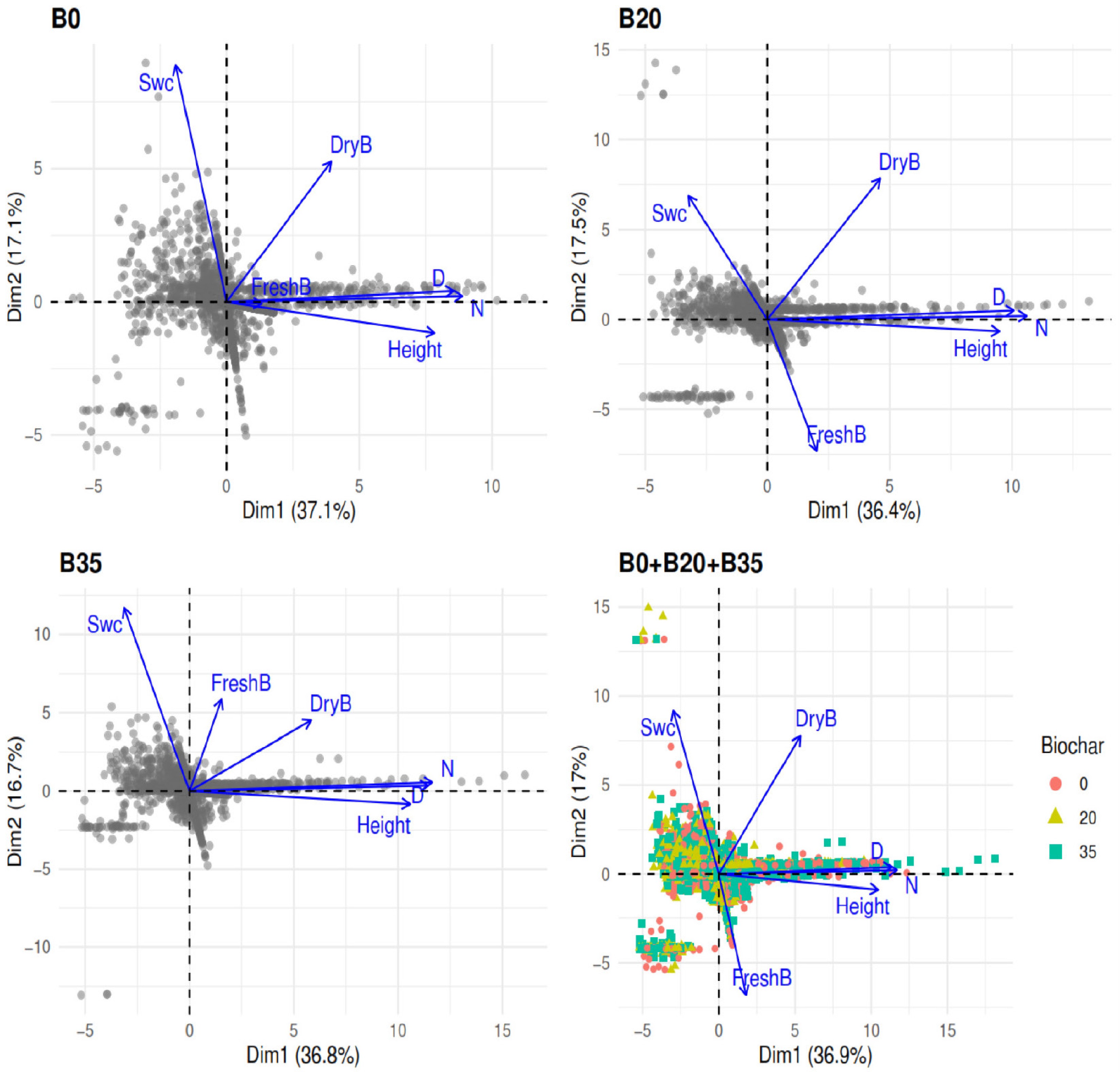 The first and second axis of the principal component analysis successfully explained 36.9% and 17% of the total variation under B0 + B20 + B35 (Fig. 6). On the first axis, soil water content was negatively associated with growth plant height, diameter, leaf number, fresh, and dry biomass. On the second axis, soil water content was positively associated with dry biomass, plant diameter, and leaf number, but negatively associated with fresh biomass and plant height. Generally, the PCA of variables under B0, B20, and B35 followed the same trend as for B0 + B20 + 35 (Fig. 6).