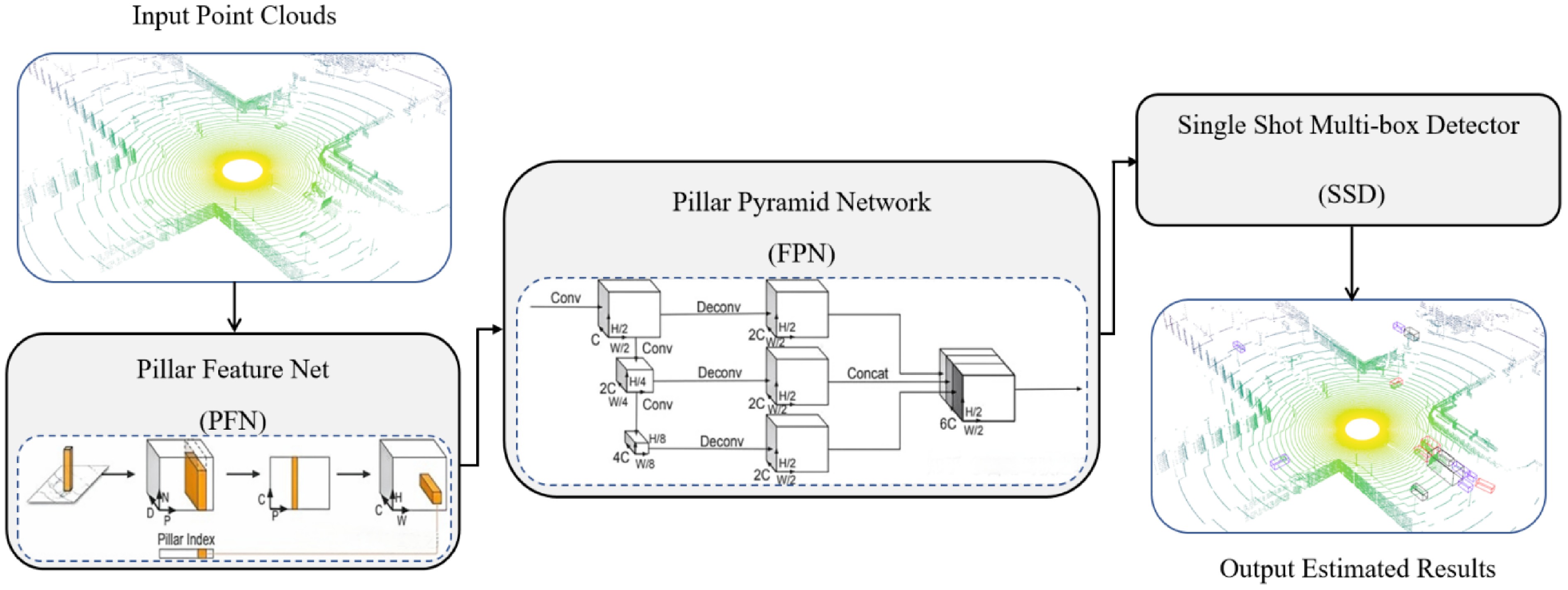 In this study, PointPillars is employed to detect and classify traffic objects, particularly vehicles, at intersections using point cloud data. The model's architecture is depicted in Fig. 4, comprising three main modules: (1) Pillar Feature Network (PFN): this module transforms 3D point cloud data into 2D sparse pseudo-images by dividing the point cloud into 'pillars'. The dimensions of the point cloud vectors, the number of non-empty pillars, and the number of points within each pillar are represented as D, P, N, respectively. The process begins by converting unordered point cloud data into a normalized 4-dimensional tensor. This is achieved by defining the spatial range of the point cloud and determining the size of each pillar. Each point is assigned to a corresponding pillar based on its spatial location, and a fixed number of points are randomly sampled from each pillar (zero-padding is applied if fewer points are present). Further operations, such as mean and center encoding, expand the dimensions. The features are then extracted through fully connected layers and max pooling. The final output is a 64-dimensional 2D pseudo-image, which can be processed using a convolutional framework similar to YOLO. (2) FPN: in this module, the sparse pseudo-images generated from the point cloud data are fed into a convolutional neural network (CNN) backbone. This network extracts both fine-grained and coarse-level features through convolution, enabling accurate detection of objects at varying scales. By integrating different levels of the network hierarchy, multi-scale features are captured. The input data is represented by the number of channels C, height H, and width W. (3) Single Shot Multi-Box Detector (SSD): the SSD serves as the detection head, producing the final output, which includes 3D bounding boxes, object categories, and confidence scores. The classification loss, localization loss, and orientation loss collectively form the loss function to train the PointPillars model. Specifically, the classification loss ensures correct object category identification, the localization loss refines the bounding box coordinates, and the orientation loss ensures accurate estimation of object orientation.