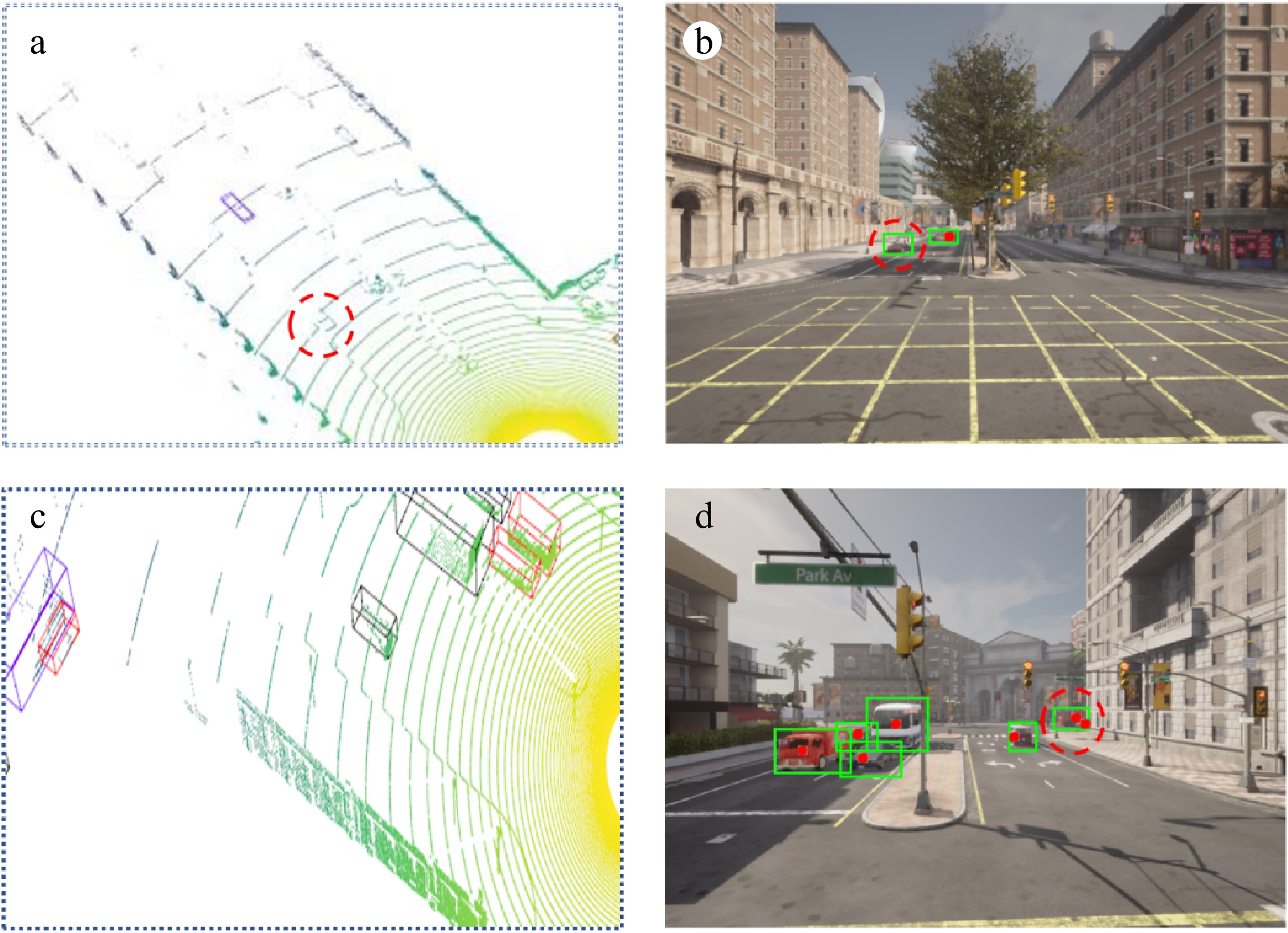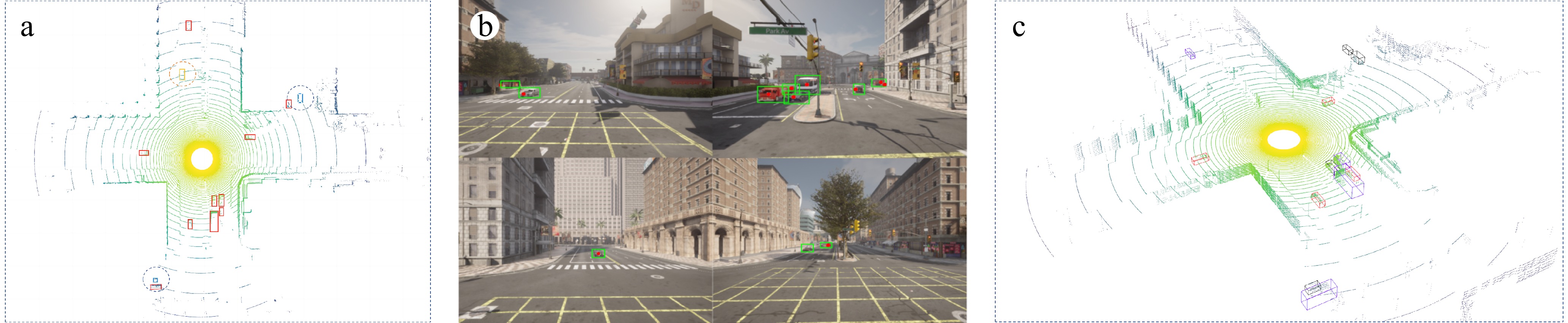 Within this digital twin system, 2D detection provides richer texture and color information. In scenarios where the 3D detector fails to identify sparse point cloud objects (as shown in the red circle of Fig. 6a), the 2D detector's perceptual results can effectively complement and enhance the 3D detector's performance (red circle of Fig. 6b). Conversely, when 2D detection fails due to occlusion (red circle of Fig. 6c), the 3D detection results projected onto the 2D view can serve as valuable hints, reducing the likelihood of missed detections (red circle of Fig. 6. Additionally, the more precise spatial position and distance information provided by the 3D detector enriches the data available to the digital twin system, further enhancing overall performance.