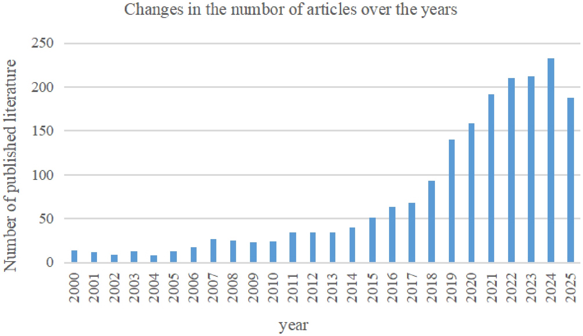 To reveal the evolutionary trends in research on vehicle lane change, this study used the Web of Science (WoS) Core Collection database as the source of literature data. The literature retrieval covered the period from 2000 to 2025, using the following topic search strategy: TS = ('lane changing' OR 'lane change' OR 'vehicle lane change' OR 'lane changing behavior' OR 'lane change decisions') AND TS = ('risk assessment' OR 'deep learning' OR 'reinforcement learning' OR 'game theory'). To ensure relevance and comparability, only journal articles were included, while conference papers, reviews, and book chapters were excluded. In addition, a manual screening of titles, abstracts, and keywords was conducted to remove entries unrelated to vehicle lane change. After rigorous screening and deduplication, a total of 1,936 English-language articles were selected for subsequent analysis. The publication year distribution reflects, to some extent, the research status, level, and development pace of this field, and visual analysis can help identify periods of intensified research activity[11]. As illustrated in Fig. 1, the annual publication volume remained relatively stable between 2000 and 2010. However, a continuous upward trend is observable post-2011. This surge is largely attributed to the widespread application of artificial intelligence in transportation, alongside advancements in data acquisition and processing technologies, which have significantly bolstered research into lane change.