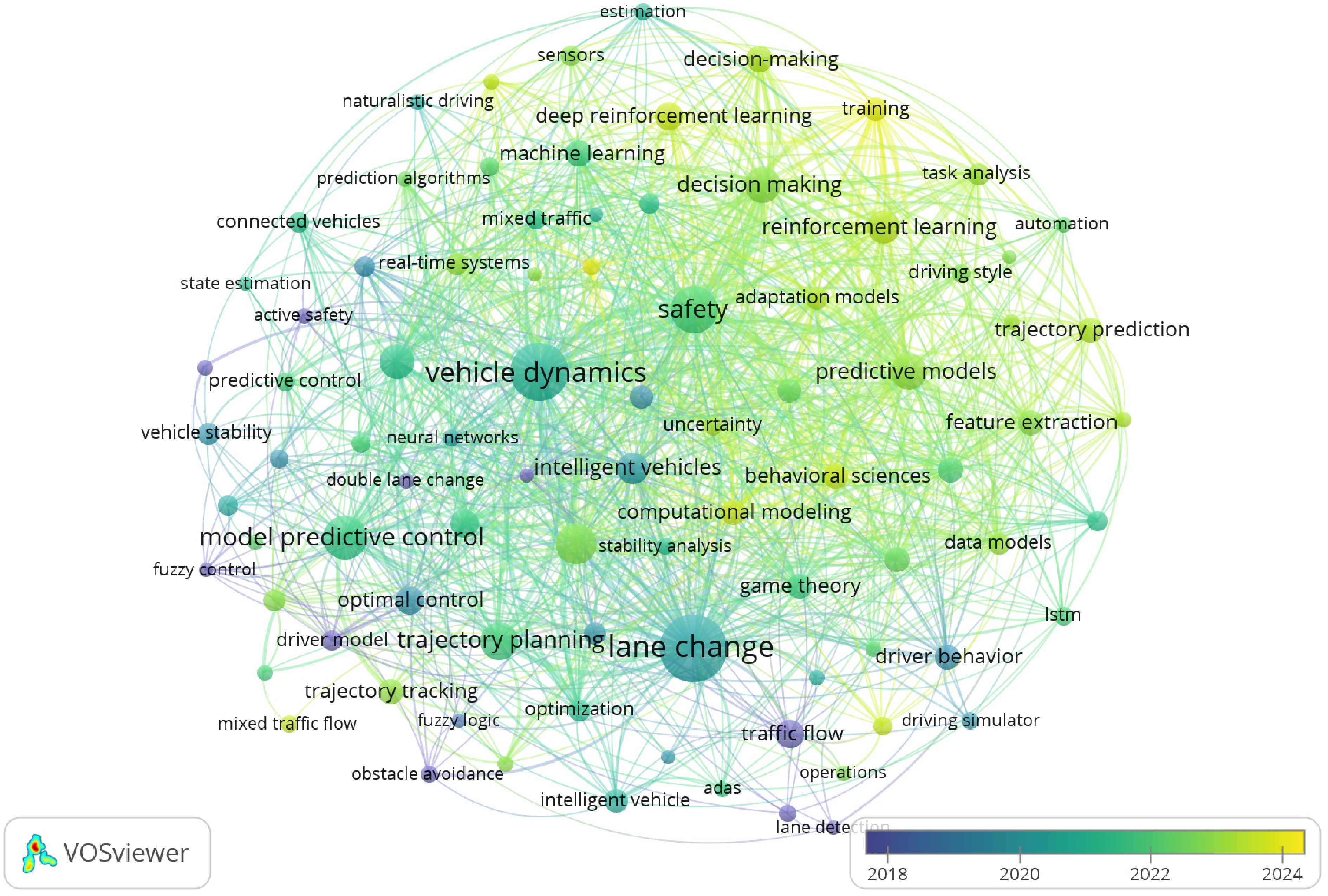 VOSviewer serves as a prominent visualization instrument within the domain of bibliometric analysis. Utilizing advanced network layouts and efficient clustering algorithms, it graphically elucidates complex relational structures among publications, including co-authorship, co-citation, bibliographic coupling, and keyword co-occurrence. In this study, 1,936 sample papers were imported into VOSviewer for bibliometric analysis, focusing on keyword co-occurrence. From the 1,936 articles, a total of 5,221 keywords were extracted for visualization. To enhance representativeness and focus, a minimum occurrence threshold of ten was applied. Furthermore, synonymous terms were consolidated, and generic or irrelevant descriptors were excluded. Ultimately, 86 core keywords satisfying these criteria were identified. The resulting co-occurrence network is illustrated in Fig. 2. Each node in the network represents a keyword, with the node size proportional to its occurrence frequency. The node color indicates the average publication year of the related literature, ranging from early studies (blue) to recent ones (yellow), thus illustrating the temporal evolution of research hotspots. As shown in Fig. 2, early studies mainly focused on lane change, vehicle dynamics, and optimal control. Subsequently, research gradually expanded to topics such as driving behavior and safety. In recent years, with the rapid development of artificial intelligence, research on lane change has increasingly shifted toward AVs, leading to the emergence of numerous data-driven lane change prediction and vehicle trajectory planning models. In the future, as vehicle–infrastructure cooperation continues to advance, developing more accurate lane change models and exploring driver behavior characteristics to improve safety, comfort, and efficiency during lane changes have become key directions in this field.