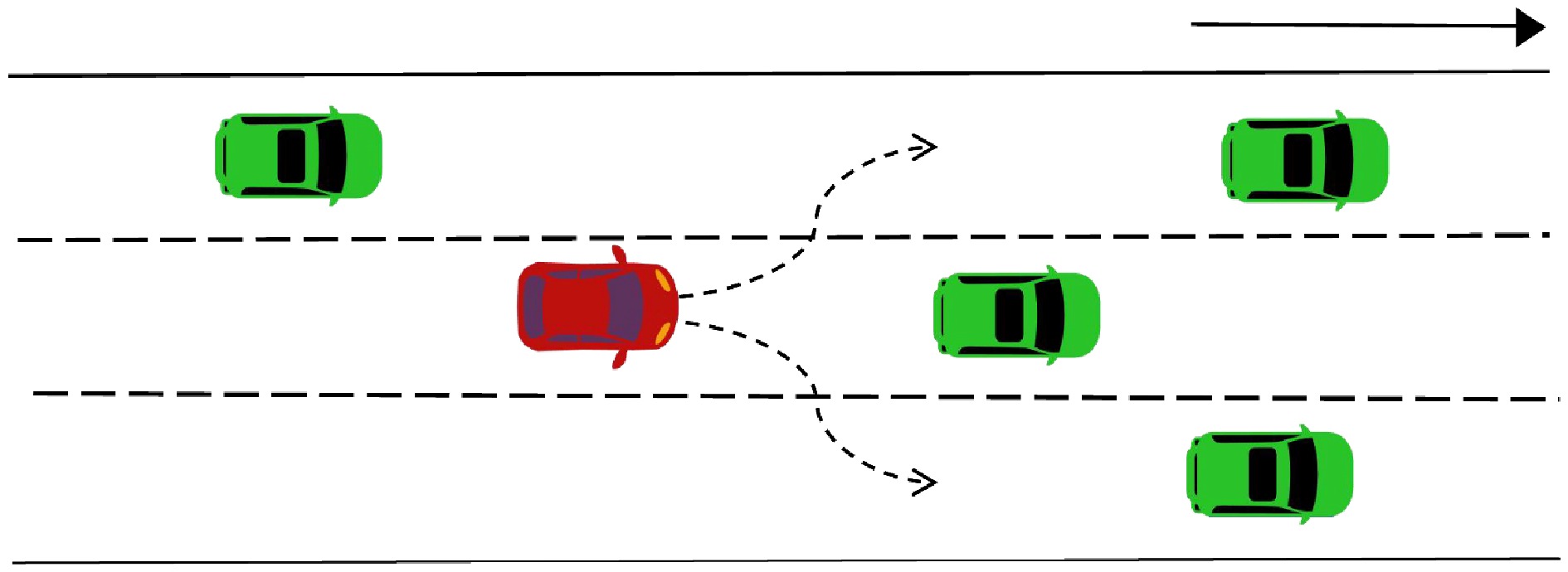 Discretionary lane change refers to a voluntary maneuver initiated to enhance travel efficiency and ride comfort, contingent upon favorable traffic conditions. The primary impetus for a discretionary lane change is typically the pursuit of a higher travel velocity or the alleviation of speed impedance. As illustrated in Fig. 3, when the subject vehicle (red vehicle) operates below its desired speed due to slower preceding traffic, the driver evaluates the kinematic states of surrounding vehicles in the target lane to execute a maneuver. In mixed traffic, AVs generally determine the optimal lane change timing through algorithmic calculations. In contrast, HVs make decisions based on individual judgment and driving preferences[13], thereby introducing elements of randomness and flexibility. The inability of AVs to accurately perceive human drivers' intentions further increases the complexity of discretionary lane change.