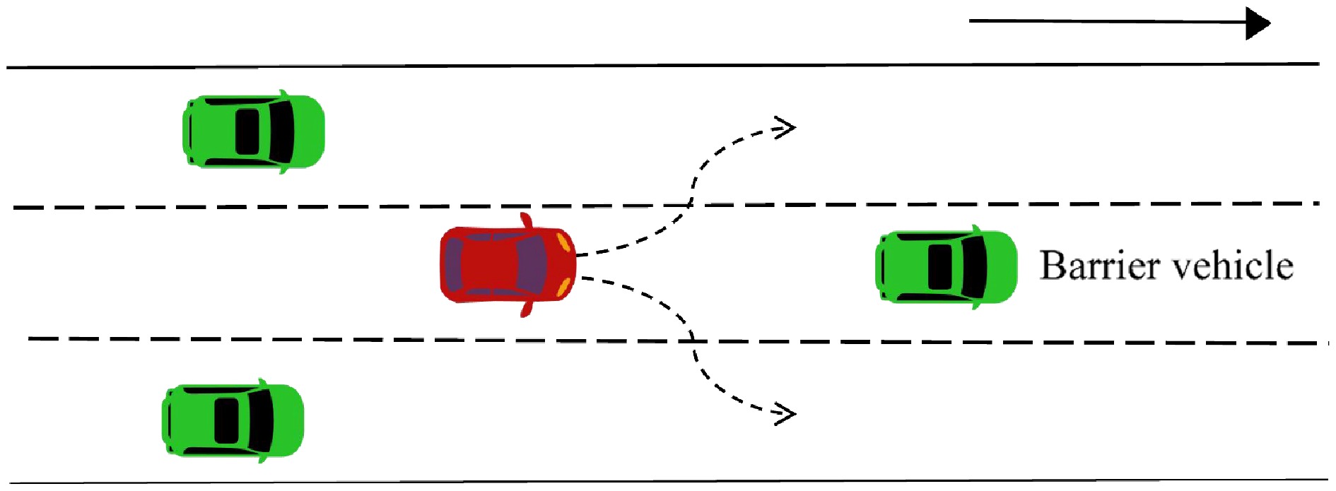Mandatory lane change refers to a vehicle's required maneuver to change lanes within a specific road section due to constraints imposed by traffic or road conditions[14]. Typical scenarios necessitating mandatory lane change include highway merging/diverging maneuvers or navigating lane closures due to construction zones or obstacles. As illustrated in Fig. 4, when the subject vehicle (red vehicle) encounters an obstacle, it must complete the lane change maneuver within a designated area. In mixed traffic, a mandatory lane change carries higher risks because it is unavoidable and follows a strongly constrained path. Compared to a discretionary lane change, it has a clear objective and must be completed within a specific spatial and temporal range, with the latest possible lane change position.
