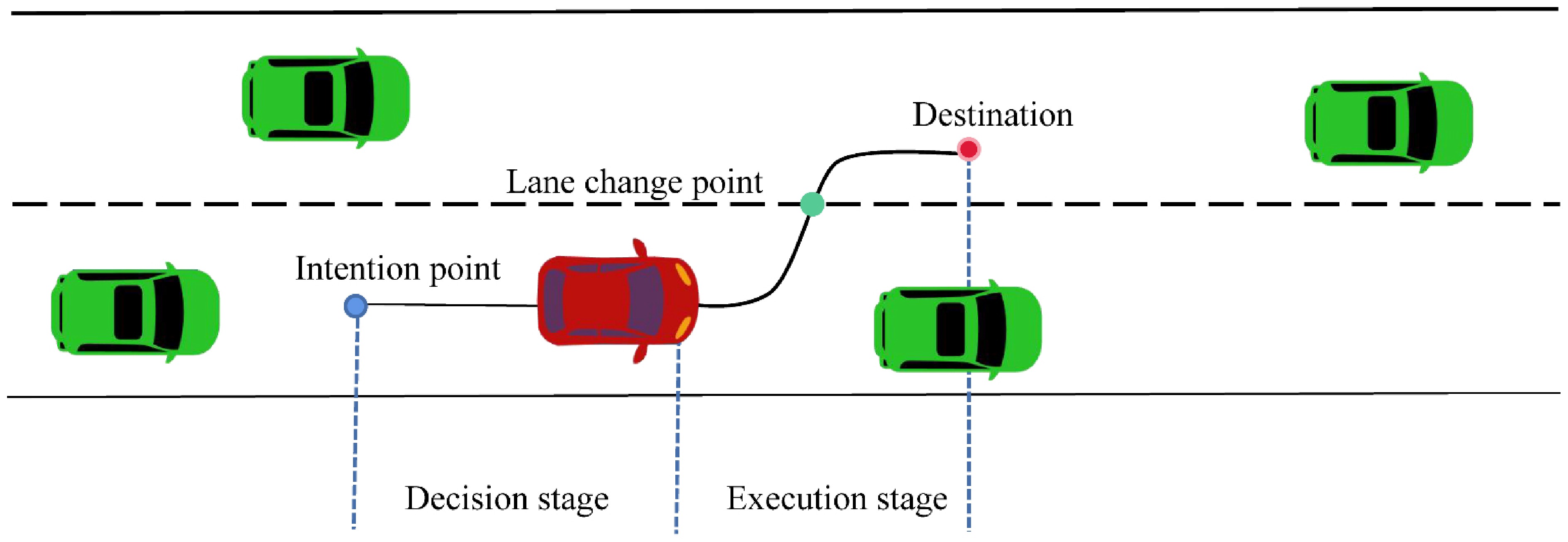 In a mixed human–machine driving environment, lane changing behavior is influenced by the dynamic evolution of surrounding traffic and the heterogeneous driving styles of human drivers. To systematically analyze the lane change mechanism in such environments, the process can be divided into a decision-making stage and an execution stage, as shown in Fig. 5. The decision-making stage refers to the stage from the moment the vehicle generates the intention to change lanes until the decision to begin the lane change is made. The execution stage begins at the lane change starting point and ends at the lane change endpoint. After the decision is made, the vehicle executes a steering maneuver to achieve a significant lateral displacement, moving continuously from the center line of the original lane towards the center line of the target lane. This phase requires handling complex dynamic interaction issues. Constructing a safe and robust lane change decision model in a mixed driving environment mandates the comprehensive consideration of proactive longitudinal maneuvers of preceding and following vehicles. Additionally, the model must accurately predict the behavioral intentions of surrounding human drivers and closely monitor the dynamic interactions between surrounding vehicles.