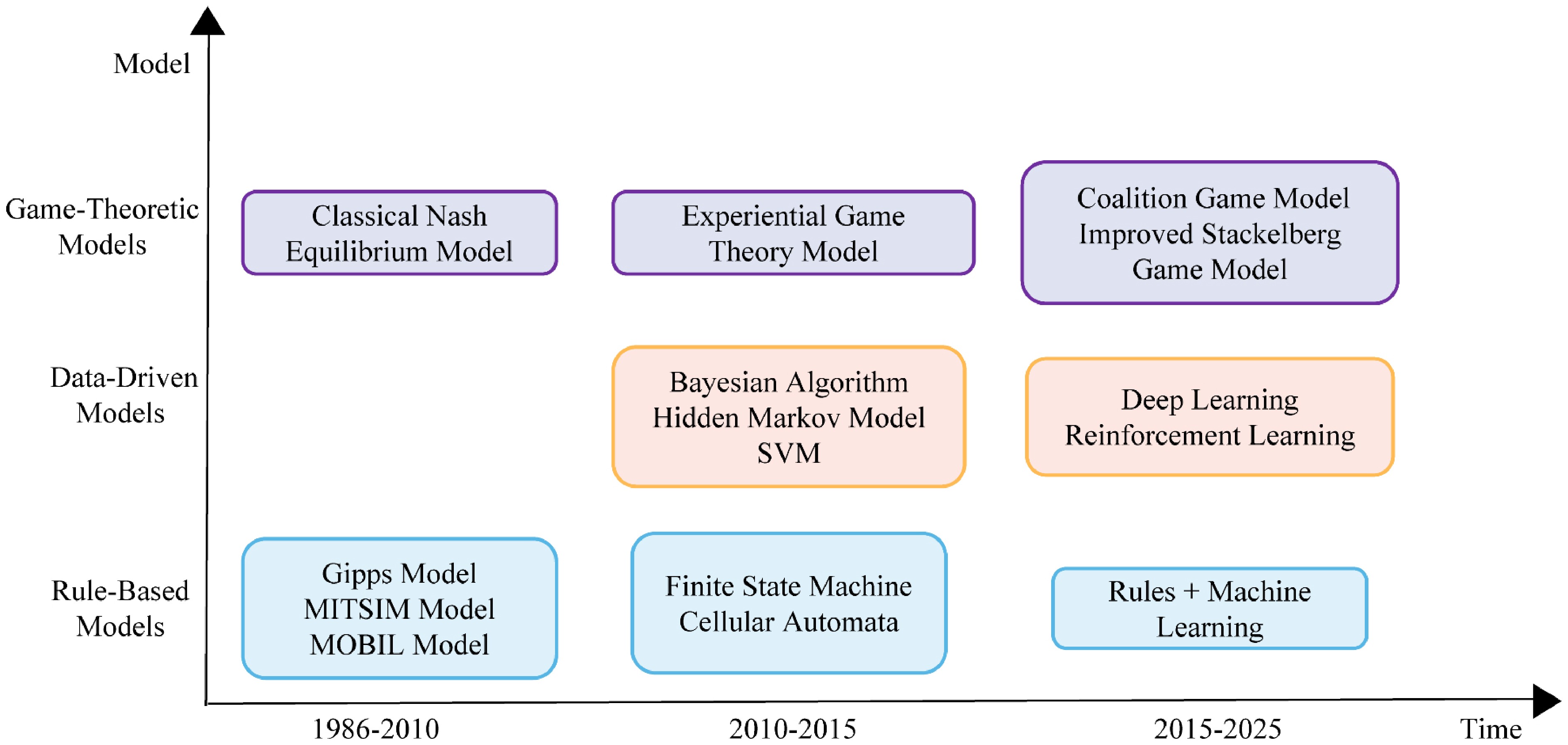Lane change decision models are designed to determine the feasibility, timing, and execution location of lane-changing maneuvers. Existing research can be broadly categorized into three primary paradigms: rule-based models, data-driven models, and game theory models. To elucidate the developmental trajectories and temporal evolution of these approaches, Fig. 6 presents a chronological organization of representative studies, highlighting the progression from rule-based methods to data-driven approaches and multi-agent game-theoretic frameworks. Rule-based models predicate decisions on predefined logical rules or kinematic principles. They are suitable for simple scenarios but lack flexibility in decision-making. Data-driven models learn lane change patterns by mining large volumes of driving behavior data. While they demonstrate strong adaptability, their performance relies heavily on extensive labeled datasets and often lacks interpretability. Game-theoretic models treat lane changing as a strategic interaction among vehicles and can better capture driver behavior, but face challenges with irrationality modeling, information requirements, and computational complexity. This chapter reviews these three decision-making models, analyzing their respective advantages and limitations.