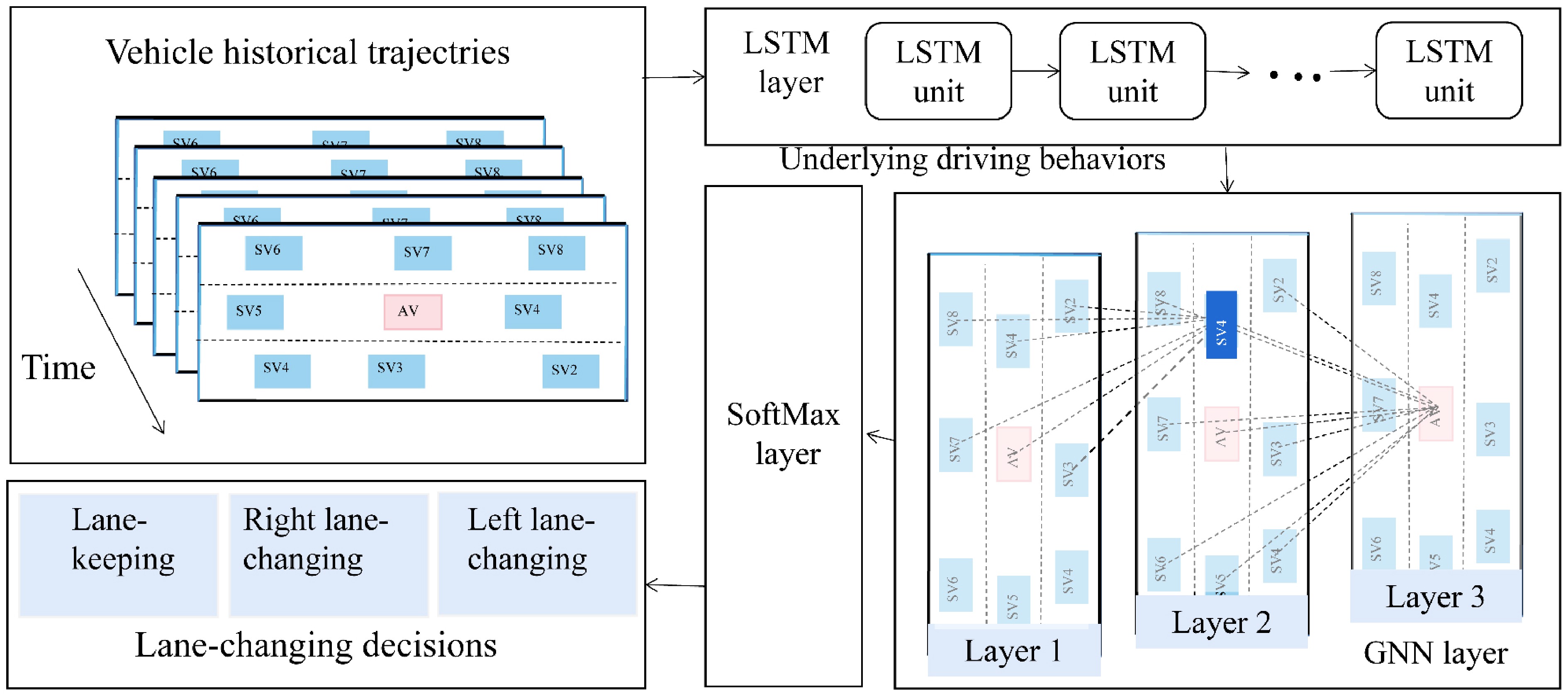 Deep learning can handle nonlinear problems in complex, high-dimensional time series, extracting lane change decision information from human driving data and capturing uncertainties in dynamic traffic. Xie et al.[46] combined a deep belief network (DBN) with an LSTM network to predict vehicle lane changes, identifying the relative position of the preceding vehicle as the key factor. However, the model did not incorporate personalized modeling of driver heterogeneity. Considering that multi-vehicle interactions affect the safety of lane change decisions, Qie et al.[47] proposed a decision-making approach that integrates LSTM with Graph Neural Networks (GNN) to model multi-vehicle interactions, as illustrated in Fig. 7. The method takes vehicles' historical trajectories as input, where the LSTM layer captures temporal dependencies in the trajectories and encodes the potential driving behavior of each vehicle. Meanwhile, the GNN layer models interactions among multiple vehicles, including not only those between the AVs and surrounding vehicles (SVs), but also interactions among SVs themselves. Finally, the output of the GNN layer is fed into a SoftMax layer to make lane change decisions. Experimental results demonstrate that, compared with the conventional LSTM-based method, this approach improves lane change decision accuracy by 19.8%.