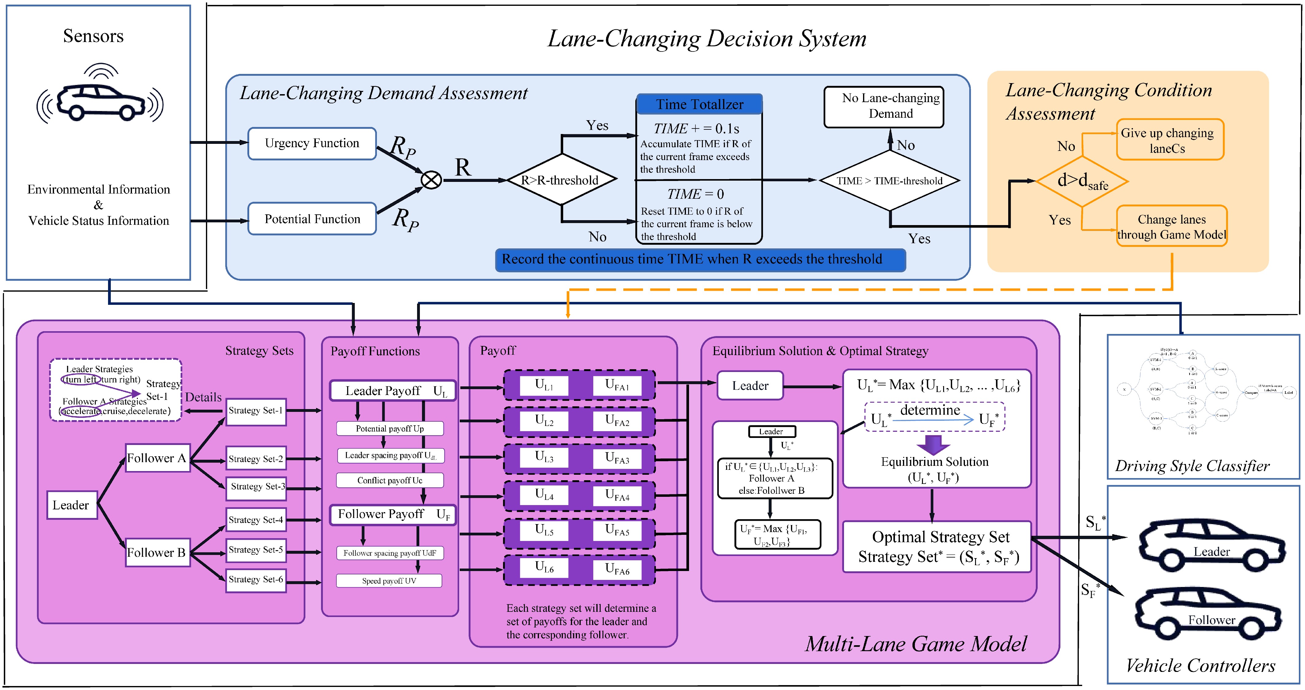 To enhance the flexibility of lane change decisions in traffic flow environments, Lu et al.[65] proposed a game-theoretic model that integrates lane change interactions with traffic flow trends. The model combines nonlinear autoregressive neural networks with Gaussian Mixture Models and Hidden Markov Models to predict both longitudinal and lateral driving intentions, while also accounting for interactions with surrounding vehicles and future traffic flow trends. Yao et al.[66] developed a lane change decision system based on an improved Stackelberg game and traffic flow information. As shown in Fig. 8, the system consists of three modules: lane changing demand assessment, lane changing condition evaluation, and a multi-lane game model. The demand function considers urgency and potential, while condition evaluation ensures safety using minimum lane changing distance. The multi-lane game model dynamically selects participants to handle complex interactions. Experimental results verified the system's foresight and the rationality of its decision-making. Table 6 summarizes game theory-based lane change decision methods. In contrast to methodologies reliant on predefined rules or empirical data patterns, game-theoretic approaches exhibit superior generalization capabilities across heterogeneous traffic scenarios. By simulating vehicle interactions and conflict characteristics, while also accounting for driving traits and driver preferences, they can effectively meet the decision-making requirements of AVs in complex and dynamic environments. Moreover, compared with reinforcement learning, game theory–based decision-making offers greater interpretability and scalability. Nevertheless, contemporary research confronts significant impediments, including high computational complexity in high-dimensional games, computational latency, and potential instability in the convergence of long-term strategic equilibria.