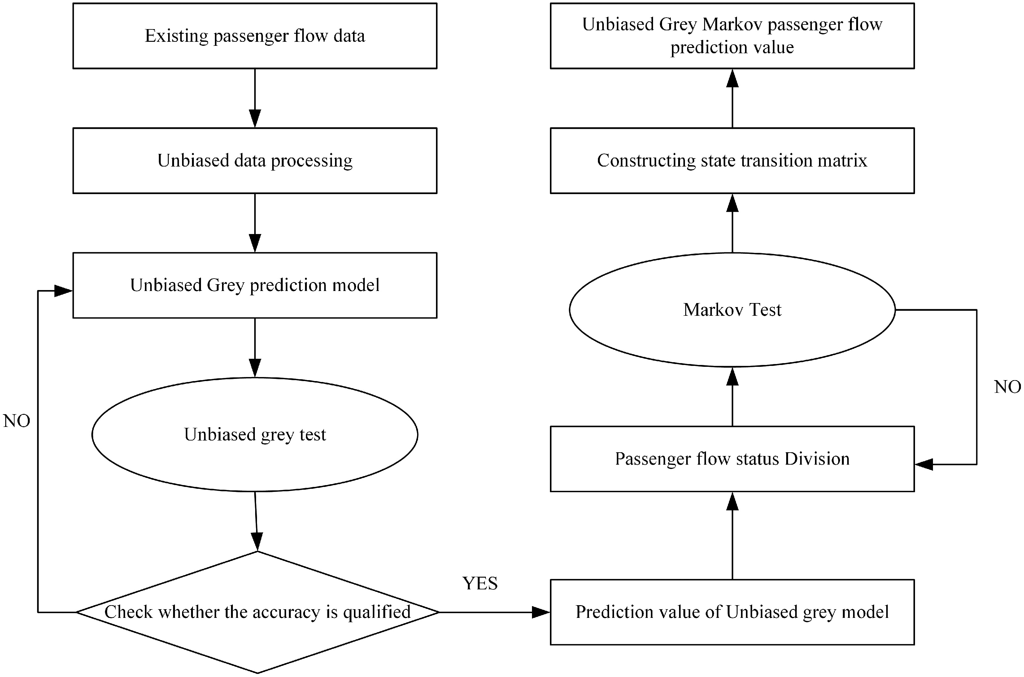 The unbiased grey Markov model can be used in conjunction with passenger flow data (inbound, outbound, and section) generated for opened lines to accurately predict future passenger flows. The specific implementation, concept, and processing of the model are shown in Fig. 1.