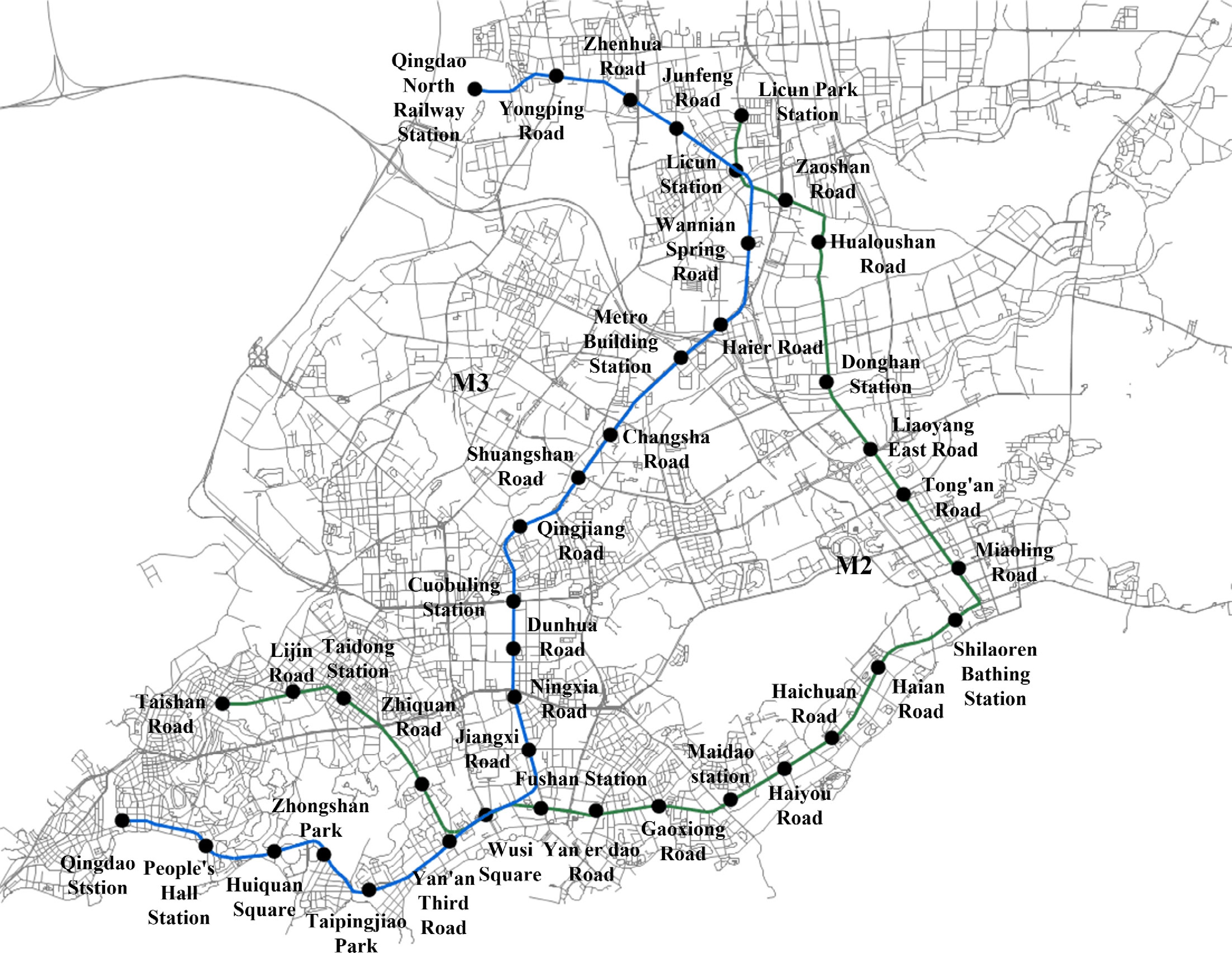 Qingdao is the largest city in Shandong Province, China. Rail transit has been in operation Qingdao since 2015 and is called the Qingdao Metro. Qingdao Metro Line 2 was used as a case study. The first phase of operation of the first section of the Qingdao Metro Line 2 began on December 10, 2017, when 18 stations from Licun Park Station to Zhiquan Road Station were opened. The second phase of operation of the first section consisted of putting Taishan Road Station, Lijin Road Station, and Taidong Station into operation on December 16, 2019. Lines 2 and 3 cross at Licun Station and Wu Si Square Station. The opening of these stations along Metro Line 2 marked a new era for the Qingdao Metro. The routes of the M2 and M3 Lines are shown in Fig. 2.