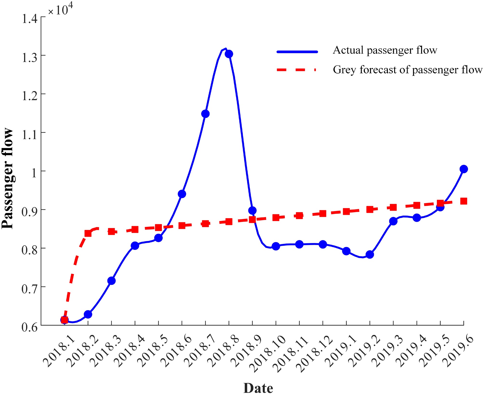 error (%)2018.1 6,138 0.00 2018.10 8,792 −9.23 2018.2 8,383 −33.41 2018.11 8,844 −9.19 2018.3 8,433 −17.87 2018.12 8,897 −9.86 2018.4 8,484 −5.20 2019.1 8,950 −12.96 2018.5 8,534 −3.24 2019.2 9,003 −14.90 2018.6 8,585 8.73 2019.3 9,057 −4.11 2018.7 8,636 24.80 2019.4 9,111 −3.66 2018.8 8,688 33.36 2019.5 9,165 −1.11 2018.9 8,740 2.63 2019.6 9,220 8.27 Both the actual and grey forecast passenger flows through Shilaoren Bathing Beach Station from January 2018 to September 2019 are fitted. The fitting results are shown in Fig. 3.
