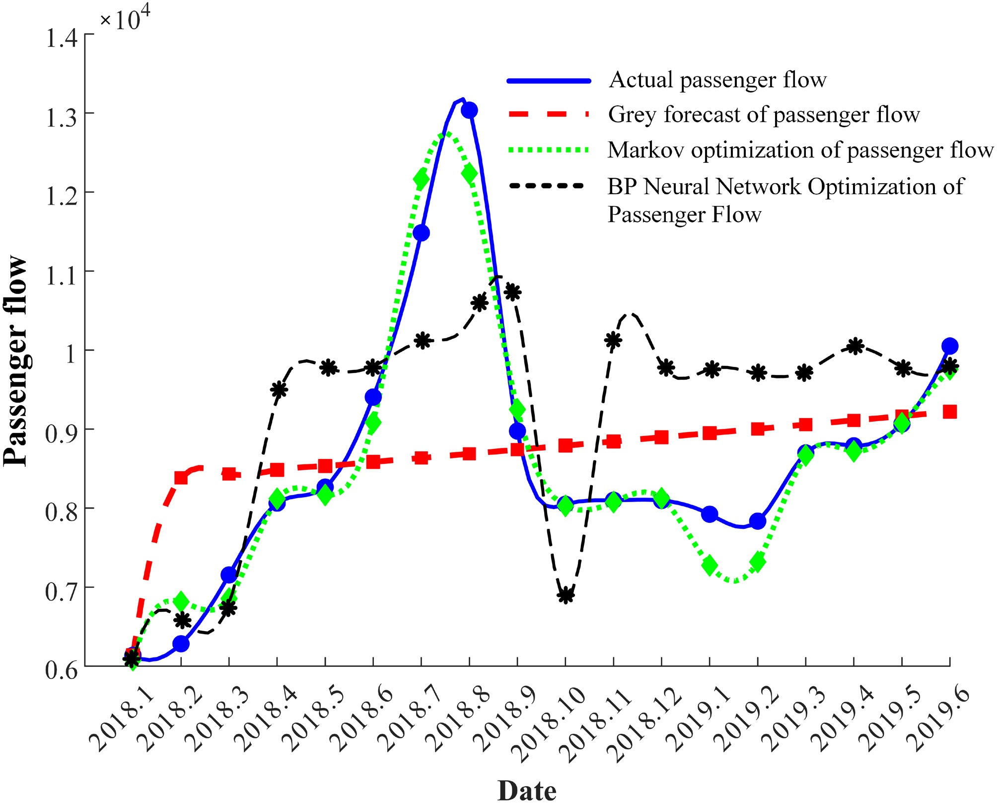 Date Optimized value (persons) Date Optimized value (persons) 2018.1 6,077 2018.10 8,029 2018.2 6,815 2018.11 8,077 2018.3 6,856 2018.12 8,125 2018.4 8,119 2019.1 7,276 2018.5 8,167 2019.2 7,320 2018.6 9,085 2019.3 8,667 2018.7 12,163 2019.4 8,719 2018.8 12,237 2019.5 9,074 2018.9 9,249 2019.6 9,757 To evaluate the effectiveness of the model, we selected the BP neural network model (a commonly used machine learning model) as a comparison. A three-layer feedforward neural network was constructed as the baseline prediction model, using a sliding window mechanism. The historical passenger flows from the previous 3 months were used as a three-dimensional input vector, which was then transformed nonlinearly in the hidden layer to output a single-step predicted value. The input data were normalized by mean–standard deviation normalization to eliminate the influence of the dimensions. The hidden layer of the network contained 10 neurons and used the hyperbolic tangent activation function, whereas the output layer consisted of linear units. The model weights were initialized using a uniform distribution strategy and optimized using a nonlinear optimization algorithm. An early stopping mechanism was introduced during the training process. Because of the limited number of training samples, the number of training parameter iterations was set to 1,000, with a learning rate of 0.01. To ensure the reliability of the results, a fixed random seed was used to control the initial conditions, and the independent experiments were repeated 10 times to report the error statistics. Figure 4 shows the results of fitting the actual passenger flow data to the grey prediction data, the Markov-optimized data, and the BP neural network model's predicted data.