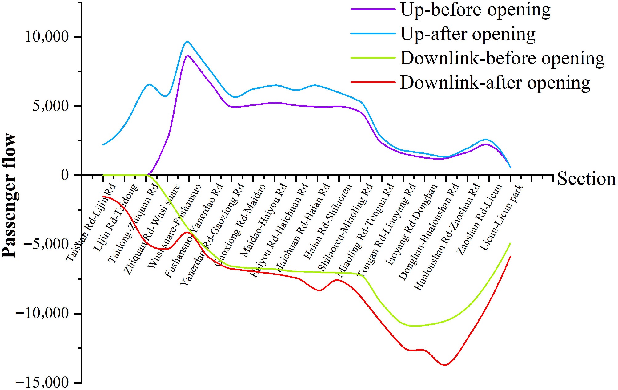 Figure 5 shows that beginning the second phase of operation of the first section substantially increases overall passenger flows along Line 2. The section of Line 2 with the largest upward passenger flow extends from Wu Si Square Station to Fushan Station. The downward passenger flow exhibits a greater range of variation than the upward passenger flow, where the section with the maximum passenger flow in the downward direction extends from Donghan Station to Hualou Mountain Road Station. The section with the maximum passenger flow over the entire day reaches 13,586 person-times. The start of the second phase of operation of the first section does not change the trend of passenger flows for any of the other sections, and the passenger flow through the first phase of the first section still decreases along the trains' direction.
