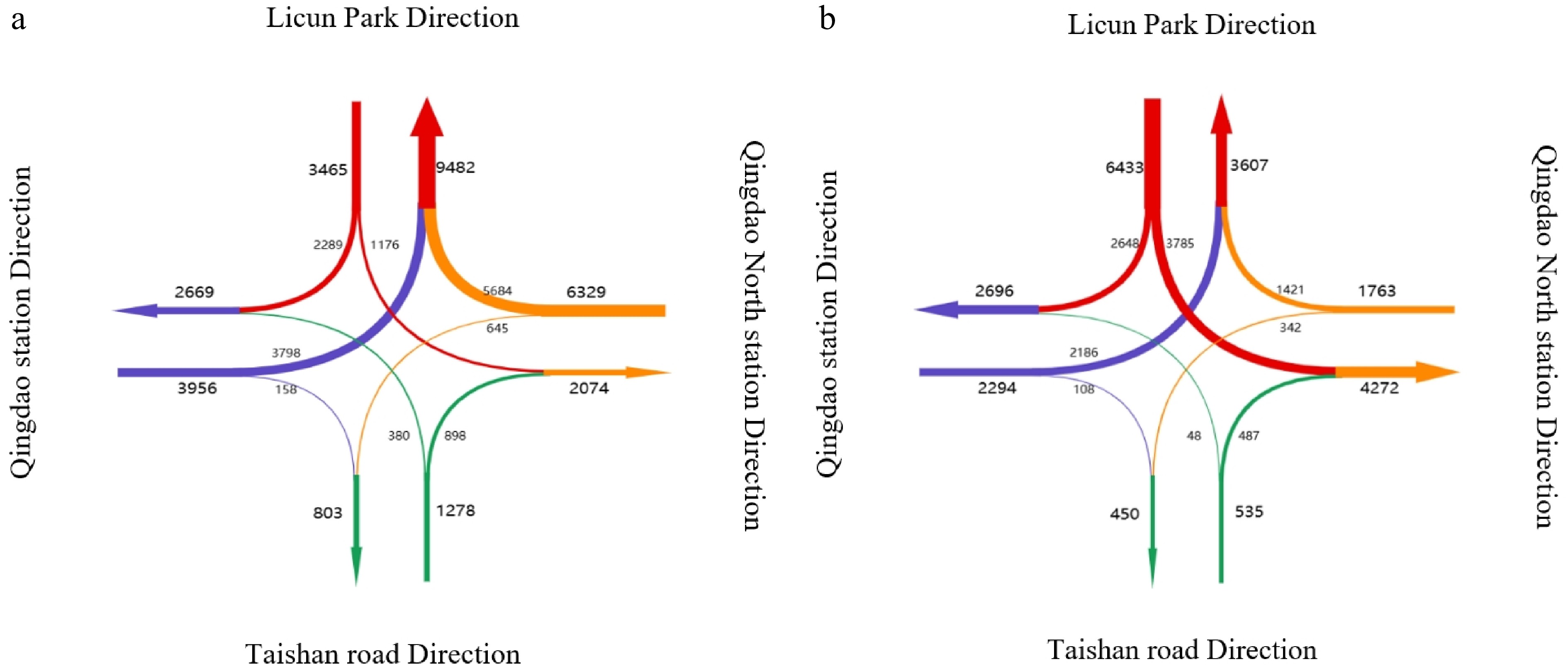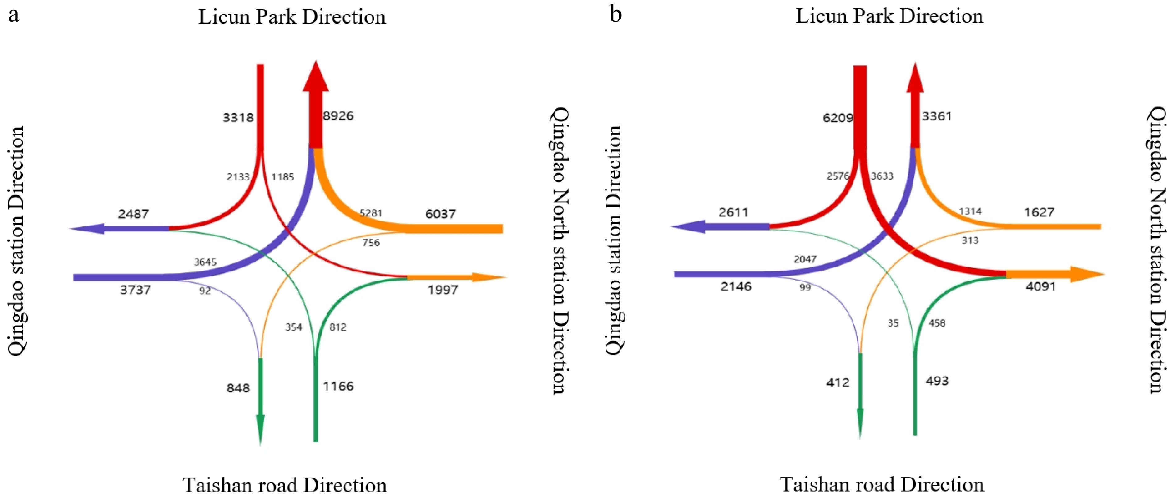 Actual direction of passenger flows through Wu Si Square Station in the morning and evening peak times. (a) Morning rush hour. (b) Evening rush hour.