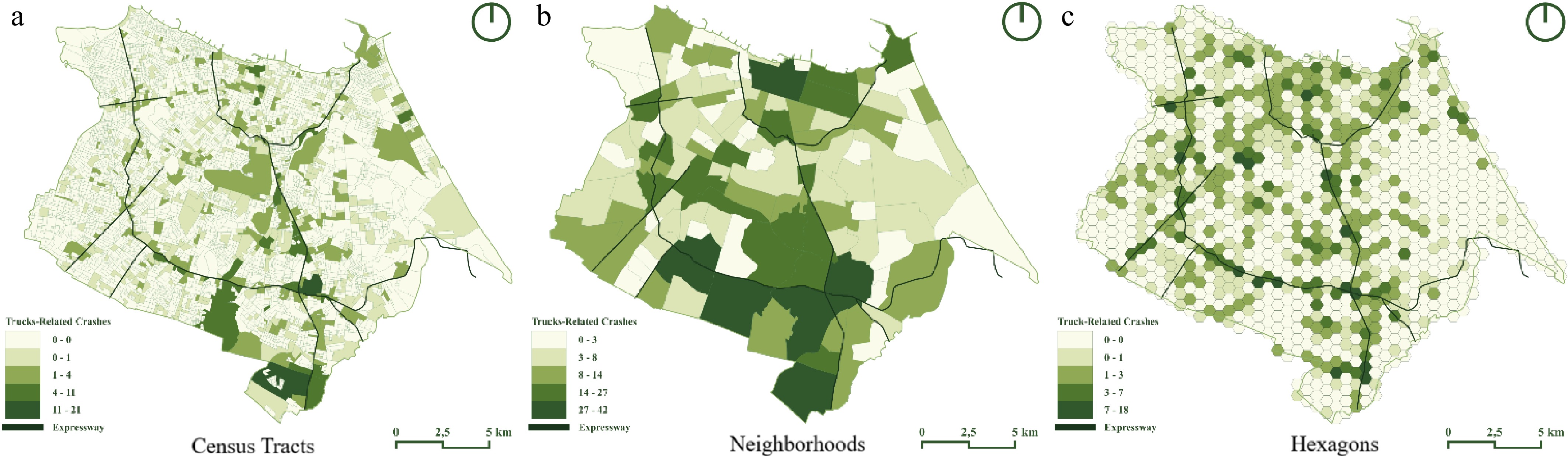 Therefore, policymakers should adopt a multi-layered spatial strategy: using hexagonal units for precision interventions, neighborhood models for regional infrastructure and mobility planning, and census tracts for broader socio-economic profiling. This hybrid approach ensures that interventions are both spatially responsive and functionally scalable, aligning urban safety investments with the actual geography of risk exposure. It also provides a strong basis for data-driven decision-making, prioritizing high-impact zones and allocating resources efficiently to reduce the frequency and severity of freight-related crashes in urban environments.