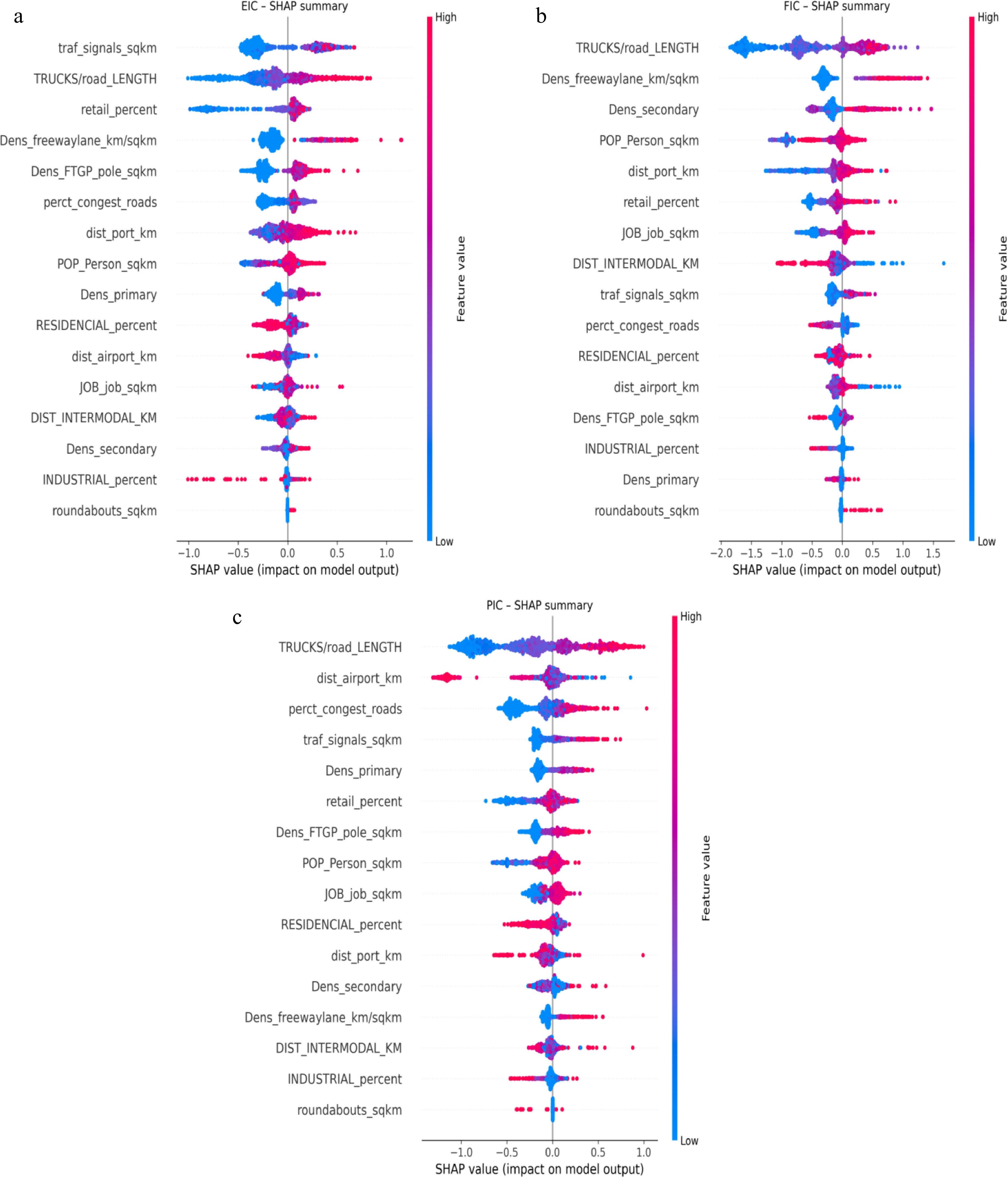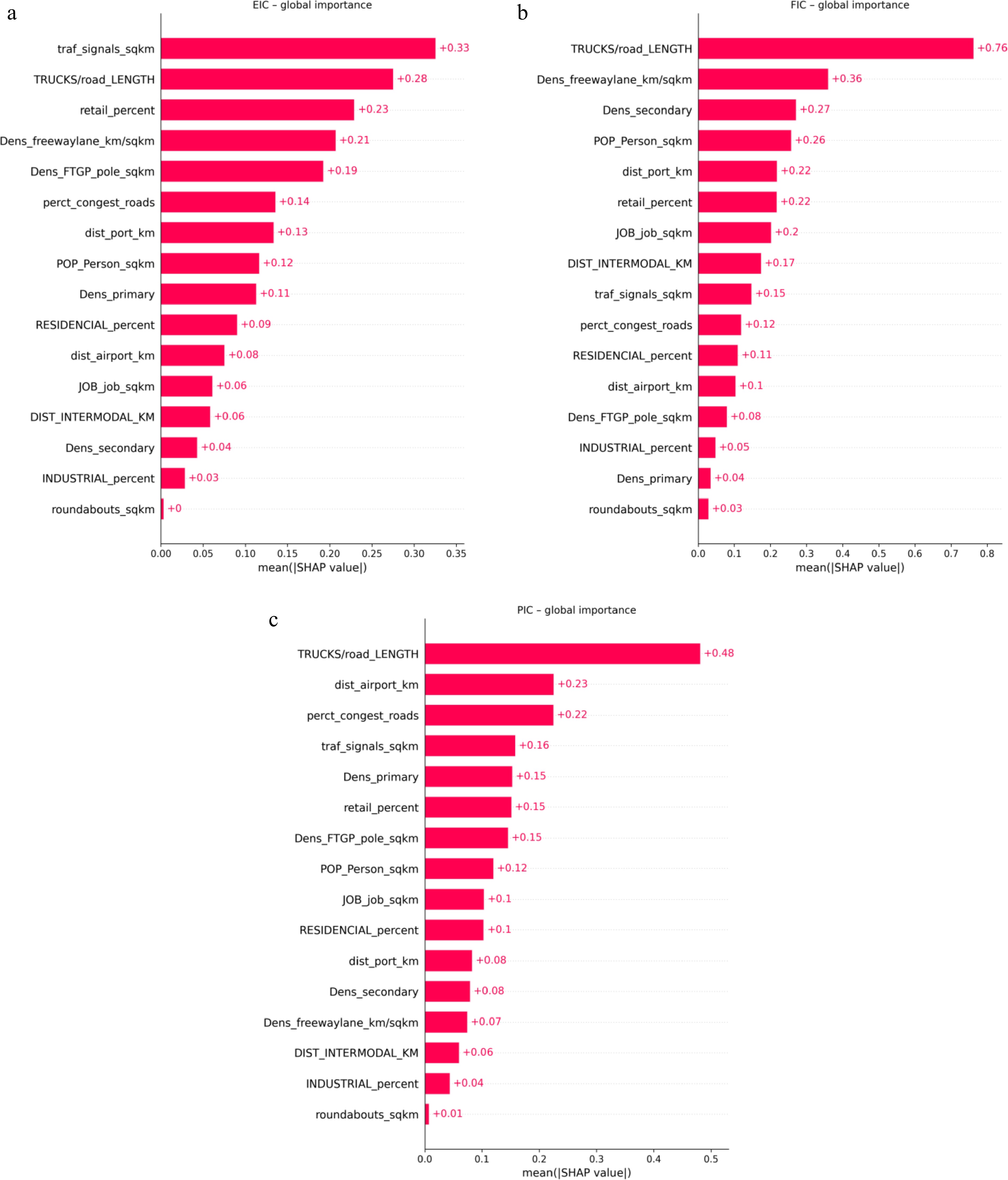And finally, Fig. 3c shows that the SHAP feature influence analysis of PIC indicates that the density of truck volumes per km2 of road is the most influential factor, with a mean SHAP value of +0.48, confirming that higher freight intensity strongly increases the likelihood of minor injury crashes. This is followed by distance to the airport (+0.23) and percentage of congested roads (+0.22), suggesting that areas closer to major freight hubs and those with higher traffic congestion are more prone to minor truck-related injuries. In addition to the density of traffic signal (+0.16), the density of primary road, percentage of retail land use, and density of freight trip generation poles all show similar influence levels (each +0.15), indicating that intersection complexity, freight generation hubs, and commercial activity contribute significantly to potential injury occurrences. Moderately important variables include population density, job density, and percentage of residential land use, which reflect the impact of traffic infrastructure and urban activity intensity. In contrast, variables like distance to seaports, density of secondary roads, and density of freeways have weaker contributions. The least influential predictors for PIC include the percentage of industrial land use and the density of roundabouts, with near-zero SHAP values, implying minimal effect. Overall, the SHAP results suggest that PICs are driven largely by freight volume, urban access points, and infrastructure-induced traffic complexity, reinforcing the need for localized safety measures in mixed-use, high-traffic zones.