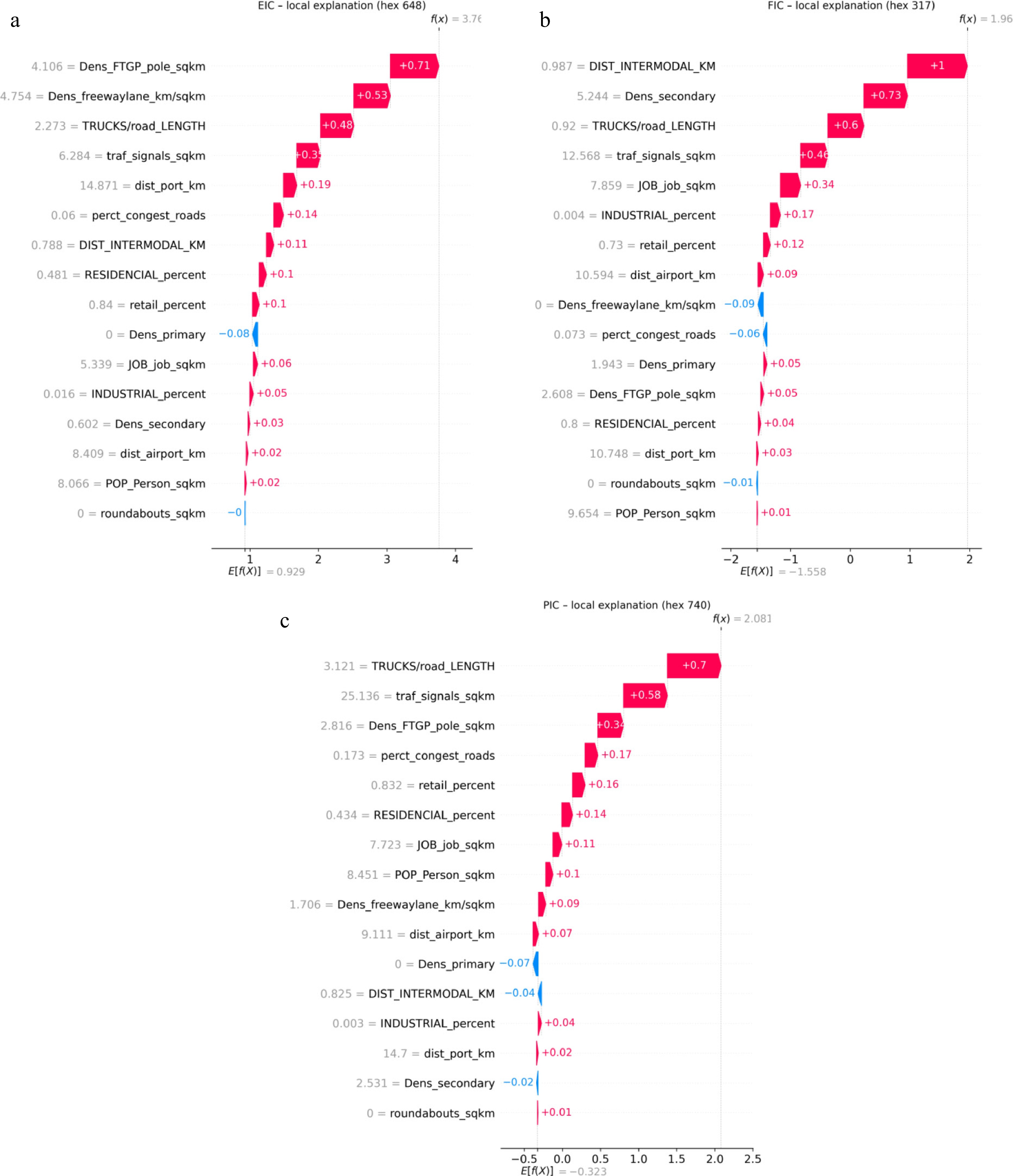 Finally, the SHAP waterfall plot for hexagon 740 is shown in Fig. 5c, where the predicted value for PIC is 2.081, considerably higher than the model's average baseline prediction of −0.323. This elevated prediction is largely driven by a combination of freight intensity and urban infrastructure factors. The most influential contributor is the density of truck volumes per km2 of road (3.121), which adds +0.70 to the prediction, indicating strong freight exposure in this area. This is followed by a very high density of traffic signals (25.136 per km2), contributing +0.58, reflecting complex intersections that increase the likelihood of minor crashes. Other positive contributors include density of freight trip generation poles, percentage of congested roads, percentage of retail land uses and percentage of residential land uses, job density, and population density, each incrementally increasing the prediction by +0.1 to +0.34. These reflect a mix of commercial activity, urban intensity, and signal infrastructure, which are known to elevate low-severity crash risks in busy zones. In contrast, a few features modestly reduce the prediction. Notably, the density of primary road lane mileage (0) contributes −0.07, suggesting that the absence of such roads may limit through traffic and slightly dampen crash risk. Distance to intermodal terminals (0.825 km) also reduces the prediction slightly (−0.04), perhaps due to limited direct exposure or shielding by other infrastructure. Similarly, secondary road lane mileage and distance to seaport have negligible to slightly negative impacts. Overall, this explanation shows that hexagon 740's high PIC prediction is driven by intense truck activity, complex road controls, and dense, active land use, hallmarks of a busy urban-freight interface where minor crashes are more likely.