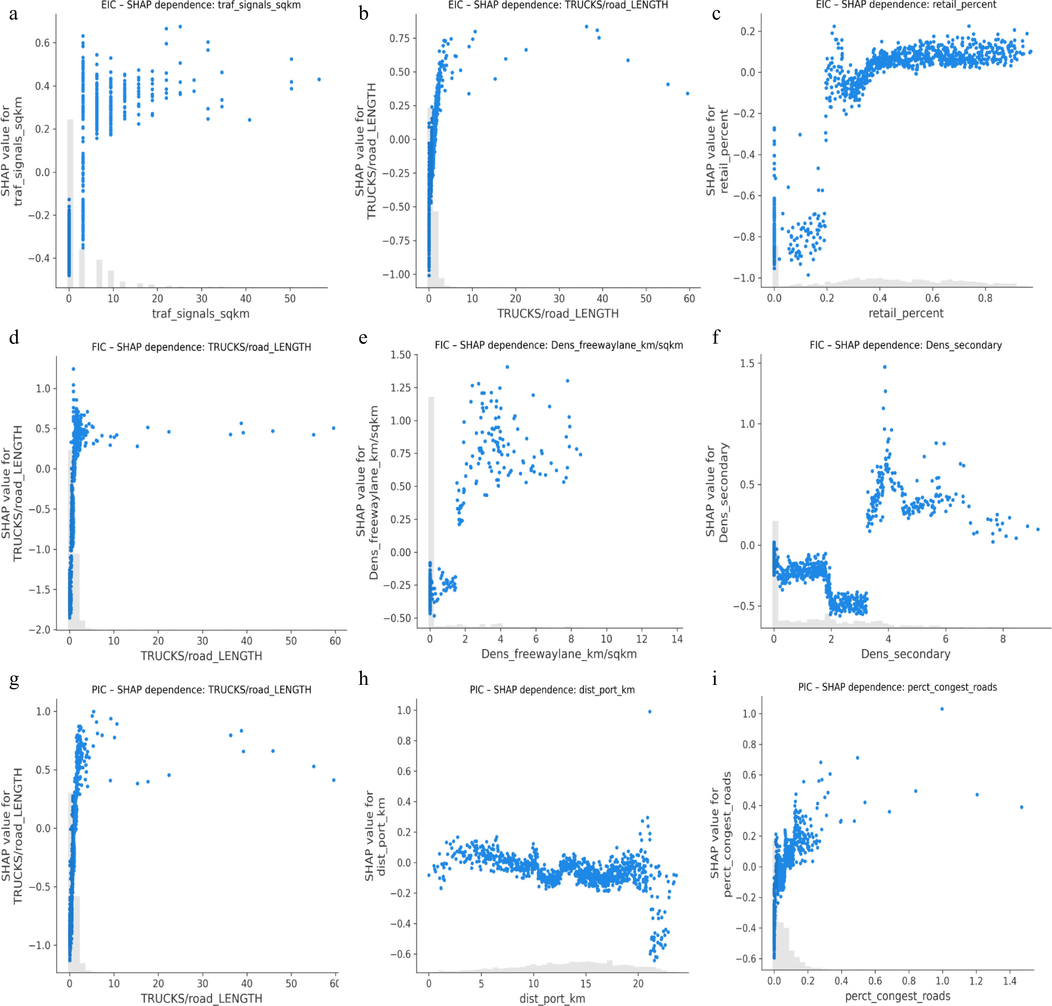 Additionally, the SHAP dependence plots for all three injury types, PIC, EIC, and FIC, are presented to visualize how the top three most influential variables affect model predictions. These plots reveal the nature and direction of each variable's contribution to injury risk, highlighting potential thresholds or non-linear effects. For EIC, the top three predictors' density of traffic signals, density of truck volumes per km2 of road, and percentage of retail land use show a strong positive influence on crash risk, with sharper increases in SHAP values at higher feature levels, particularly for density of traffic signals and freight exposure. Similarly, for FIC, key variables such as density of truck volumes per km2 of road, density of freeway, and density of secondary road lane mileage exhibit steep positive associations, indicating that high-speed freight corridors and road complexity significantly elevate fatal crash risks. In the case of PIC, the dominant predictors include density of truck volumes, distance to airport, and percentage of congested roads, all of which demonstrate non-linear relationships where risk escalates beyond certain exposure thresholds. The remaining dependence plots for additional variables are provided in Supplementary Fig. S1 for further examination. These insights not only confirm the critical role of freight intensity and infrastructure but also guide targeted urban interventions by revealing how specific variables impact different types of truck-related injury outcomes.