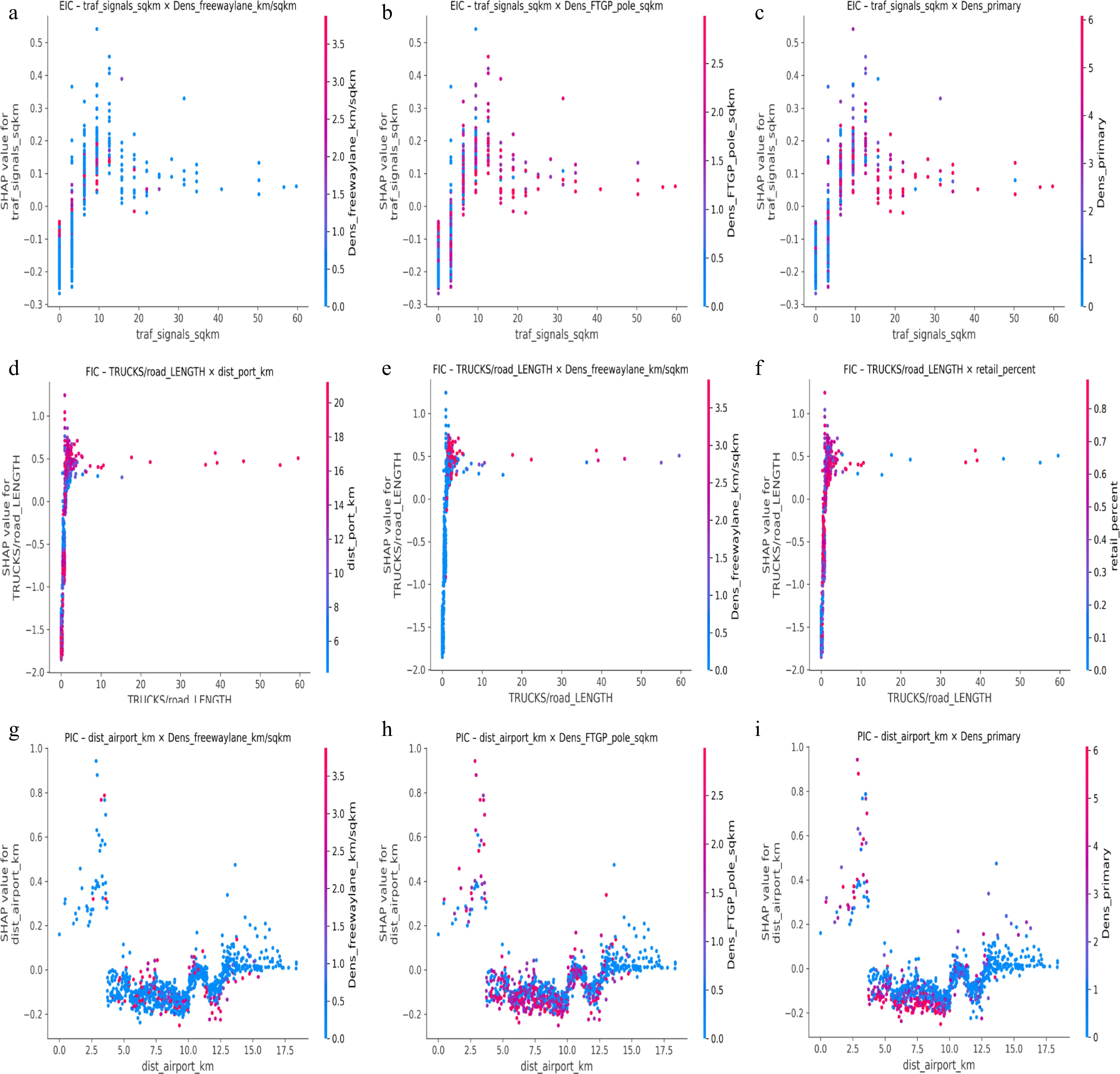 In addition, the SHAP interaction plot from Fig. 7f shows how the density of truck volumes per km2 of road affects FIC, and how this effect varies with the percentage of retail land uses. The plot indicates that areas with higher densities of truck volumes per km2 of road generally have higher SHAP values, meaning a greater positive contribution to FIC risk. Importantly, this relationship remains consistently high across varying percentages of retail land uses, suggesting retail presence does not significantly mitigate the safety risk posed by high truck concentrations. Dense retail areas (pink or red) show similarly elevated SHAP values, implying potential compound risks in commercial zones with heavy density of truck volumes. For PIC, the SHAP interaction plot shows that the relationship between distance from the airport and the densities of freeway lane mileage is moderated. Figure 7g suggests that being closer to airports (0−3 km) is associated with a higher SHAP value, indicating increased PIC risk. This effect is particularly pronounced in areas with low density of freeway lane mileage (shown in blue), possibly due to a higher percentage of congested roads or complex road structures near airports. As the distance increases beyond 7 km, SHAP values generally decrease and stabilize, indicating a lower contribution to PIC. Overall, proximity to airports appears to elevate PIC risk, especially in low freeway-density environments. Figure 7h shows the effect of distance from the airport on PIC, conditioned on the utility density of freight trip generation poles. The plot shows a clear trend: shorter distances to the airport (0−3 km) are associated with higher SHAP values, indicating a greater contribution to PIC risk. This effect is more pronounced in areas with higher FTGP pole densities (represented by pink or red dots), possibly reflecting complex road infrastructure or obstructions in such zones. As distance increases (> 5 km), SHAP values drop and stabilize, especially where FTGP pole density is low, suggesting reduced PIC risk farther from airports and in less obstructed environments.