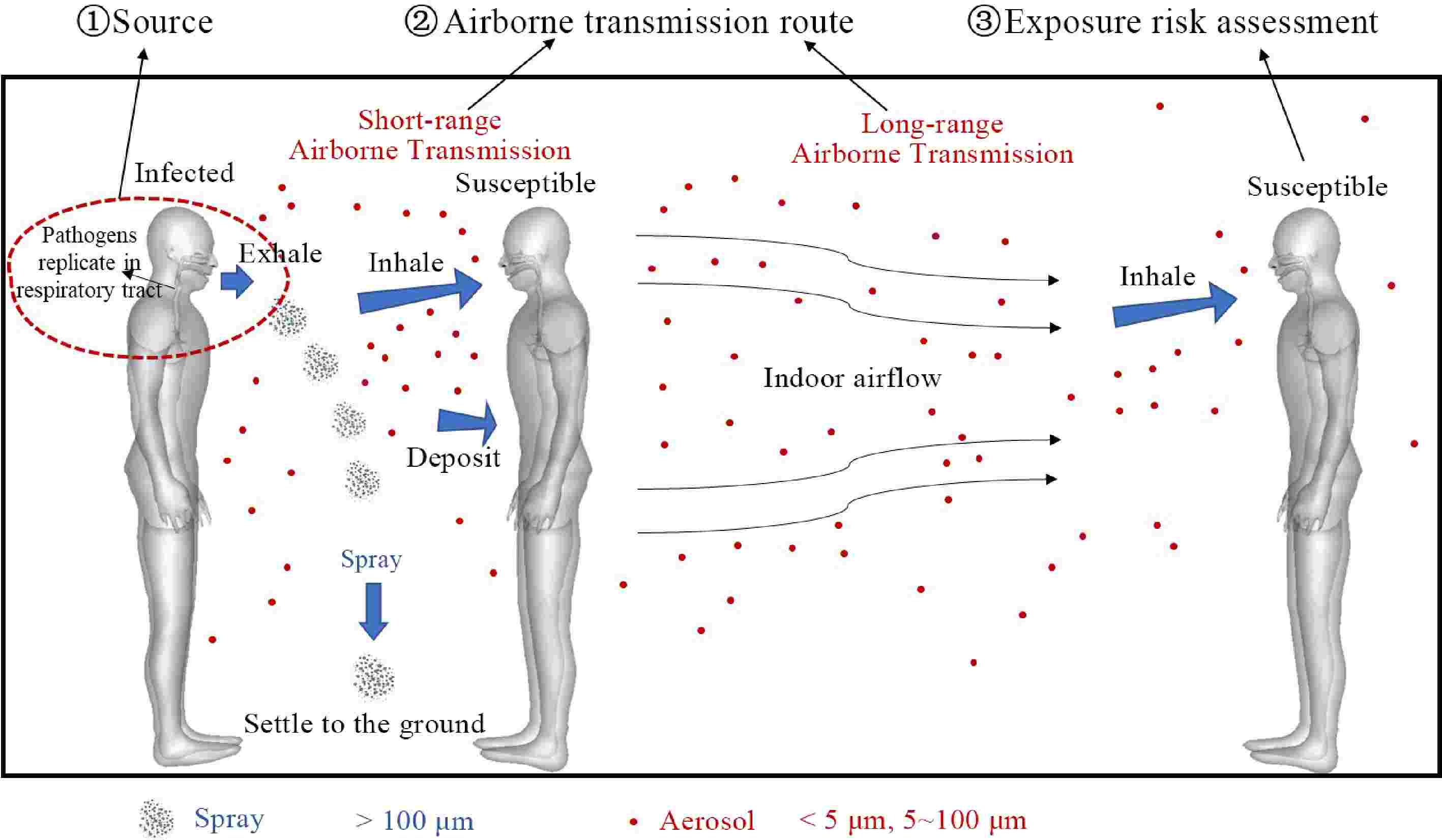 Pathogens of respiratory infectious diseases (viruses, bacteria, etc.) usually replicate in a patient's respiratory tract and enter the environment through the patient's respiratory activities (breathing, speaking, coughing, sneezing, etc.)[5,16]. Most pathogen's particle sizes are in the nanometer to micron range, such as the COVID-19 virus at about 60~140 nm[17] and the influenza virus at about 80~500 nm[18]. These pathogens usually need to be attached to a carrier for airborne transmission. Droplets and aerosols produced by respiratory activity are typical carriers[19]. The carrying infectious substances are suspended, evaporated, and dispersed in the environment and may be deposited on objects or human surfaces or inhaled by humans, posing an infection risk[20].