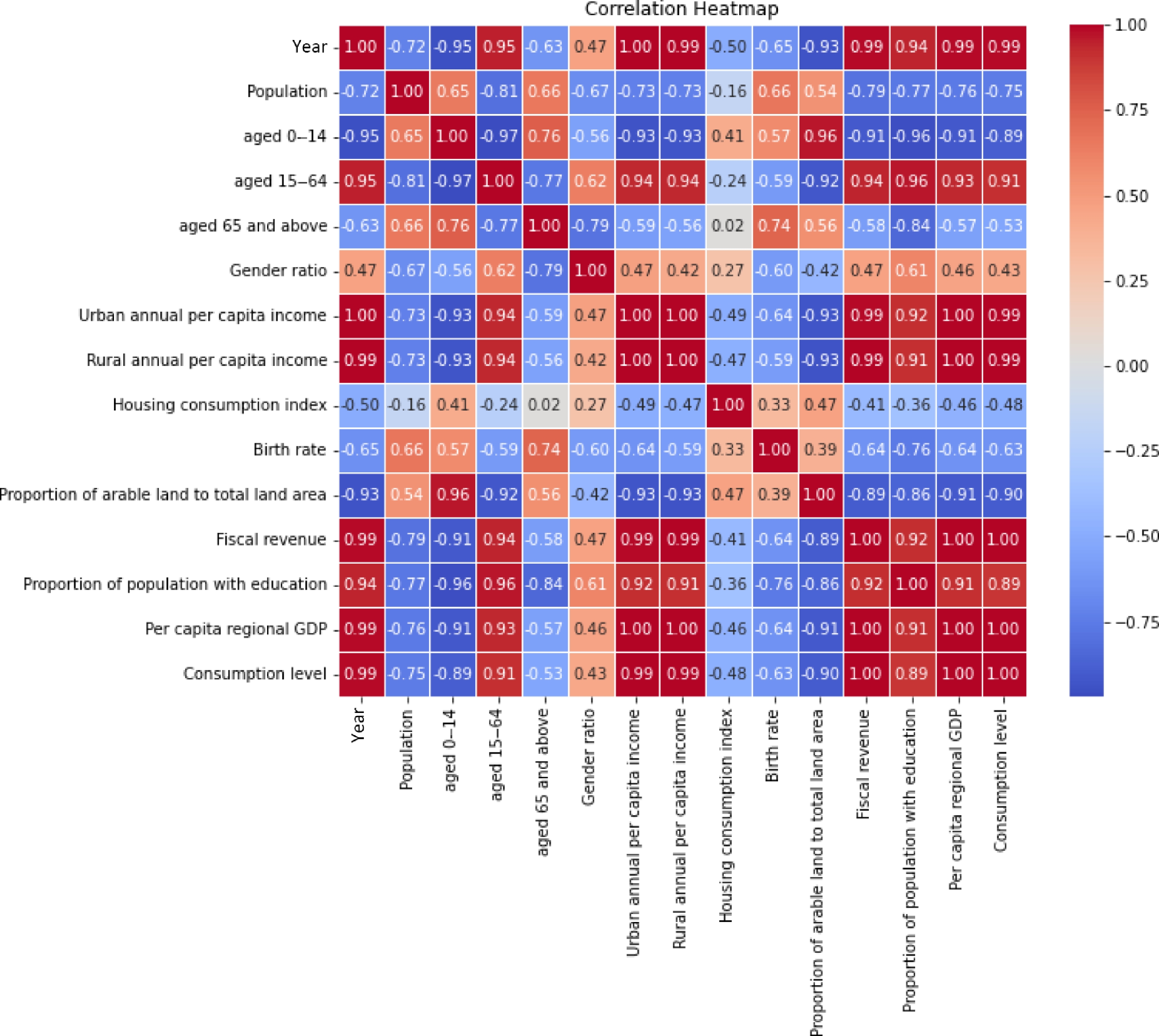 The heatmap in Fig. 1 shows the linear correlations between multiple socioeconomic indicators, with different colors and numerical values indicating the strength and direction of the correlations. Red represents positive correlations, blue represents negative correlations, and darker colors indicate stronger correlations. The correlation coefficient ranges from −1 to 1, with positive values indicating positive correlations and negative values indicating negative correlations.