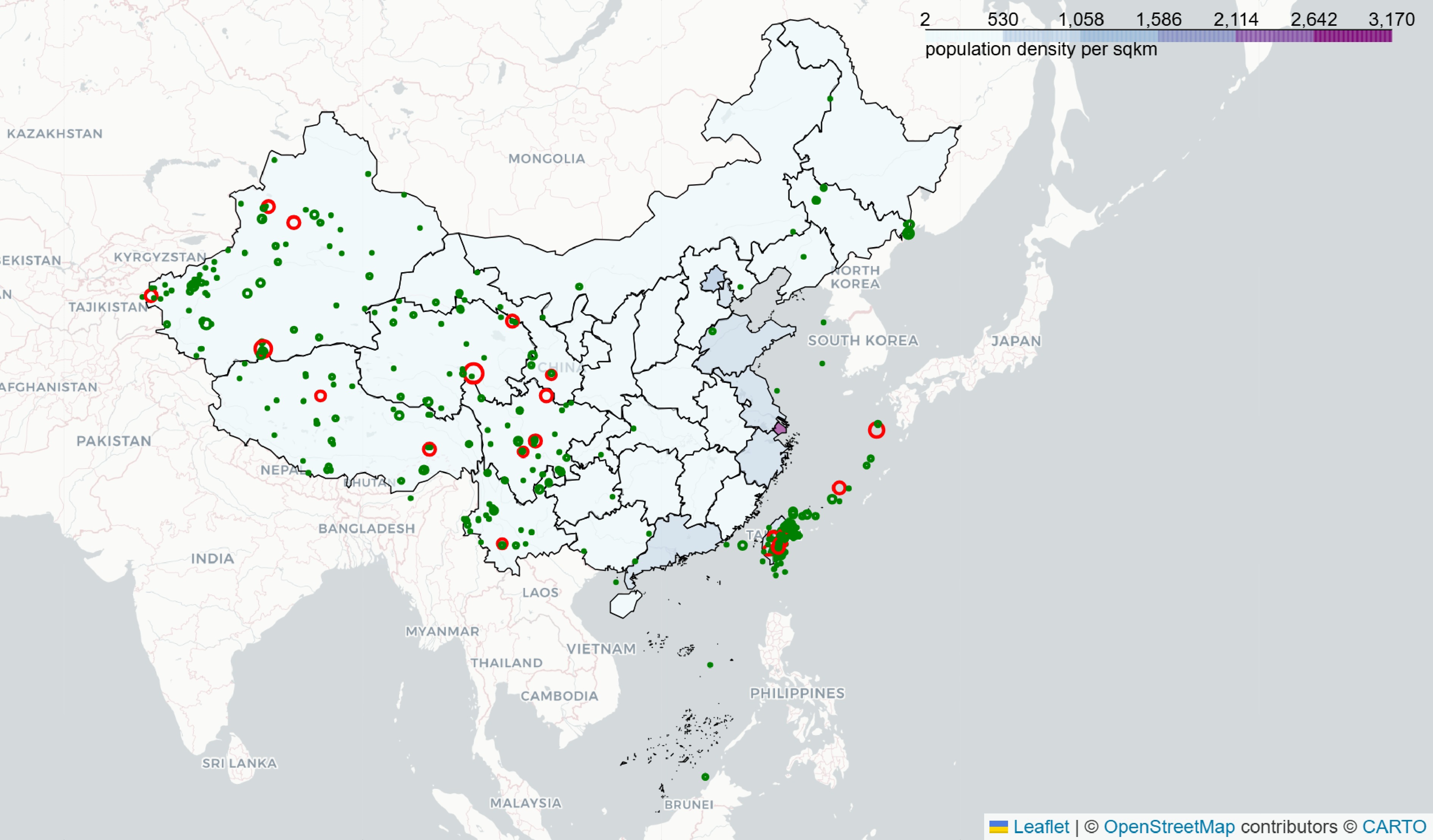 The green and red circles on the map denote earthquake events of different magnitudes. Earthquakes with a magnitude greater than 6.5 are represented by red circles; those with a magnitude of 6.5 or less are represented by green circles. The size of the circles is proportional to the magnitude of the earthquake: the larger the circle, the stronger the earthquake. Geographically, the southwestern region (including Sichuan, Yunnan, and Tibet) is one of the most seismically active areas in China, with frequent and sometimes high-magnitude earthquakes. The western regions (such as Xinjiang and Qinghai) also experience a significant number of seismic events, some of which are of considerable magnitude, indicating substantial tectonic activity. The southeastern coastal areas (including Taiwan, Fujian, and Guangdong) are also earthquake-prone, particularly Taiwan, which exhibits very frequent seismic activity, indicating a higher earthquake risk. In contrast, the densely populated eastern regions (such as Beijing–Tianjin–Hebei and the Yangtze River Delta) experience fewer earthquakes but because of their high level of urbanization, any seismic event in these areas could result in significant consequences.